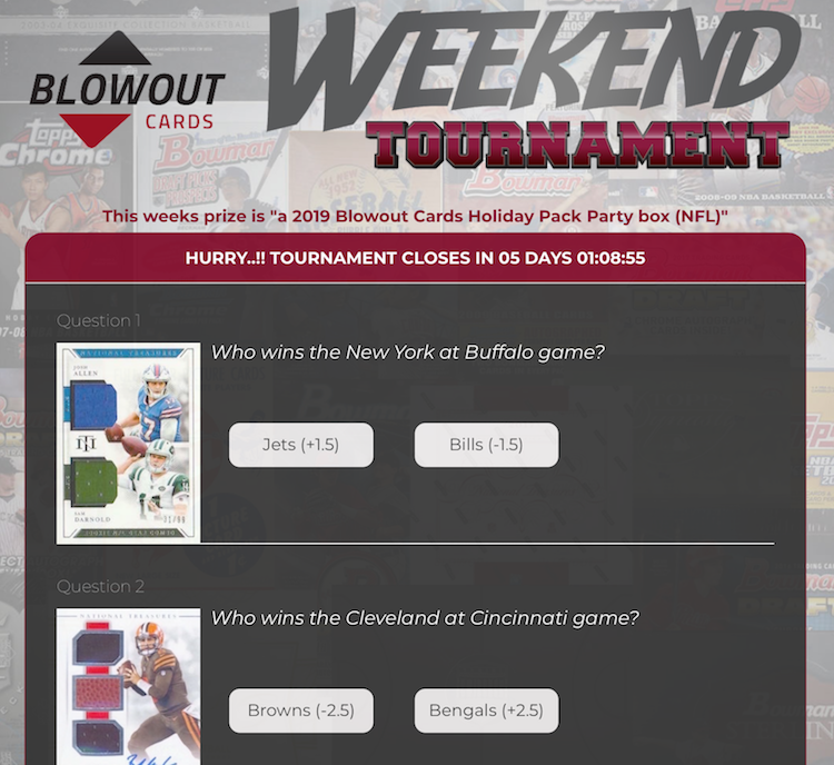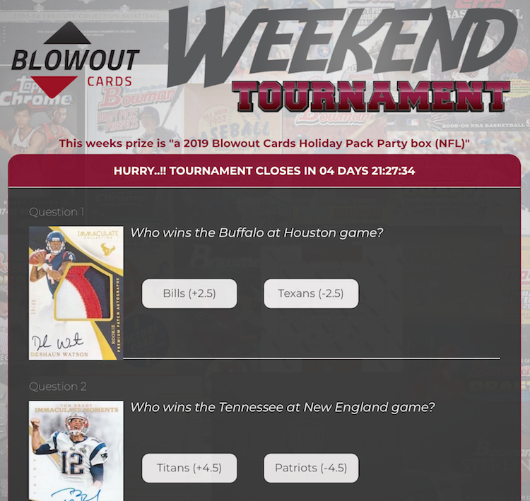 The Wild Card Weekend picks prize is a 2019 Blowout Holiday Pack Party football box -- a mix of many popular NFL releases all in one place with plenty of big-card potential.