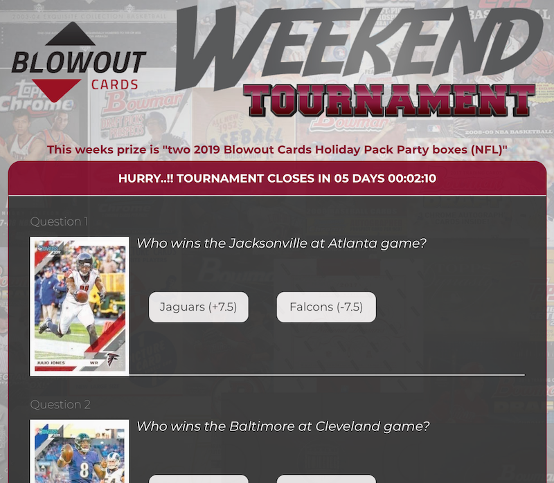 The Week 16 prize is not one but two 2019 Blowout Holiday Pack Party football boxes -- a mix of many popular NFL releases all in one place with plenty of big-card potential.