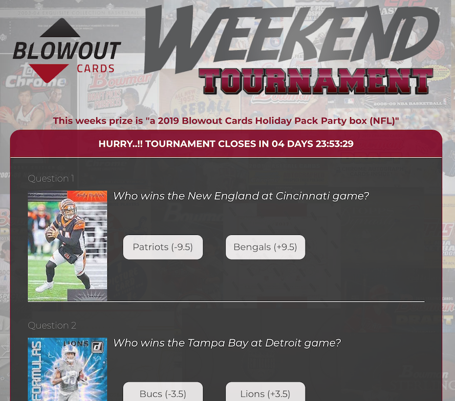 The Week 15 prize is a 2019 Blowout Holiday Pack Party football box -- a mix of many popular NFL releases all in one place with plenty of big-card potential.