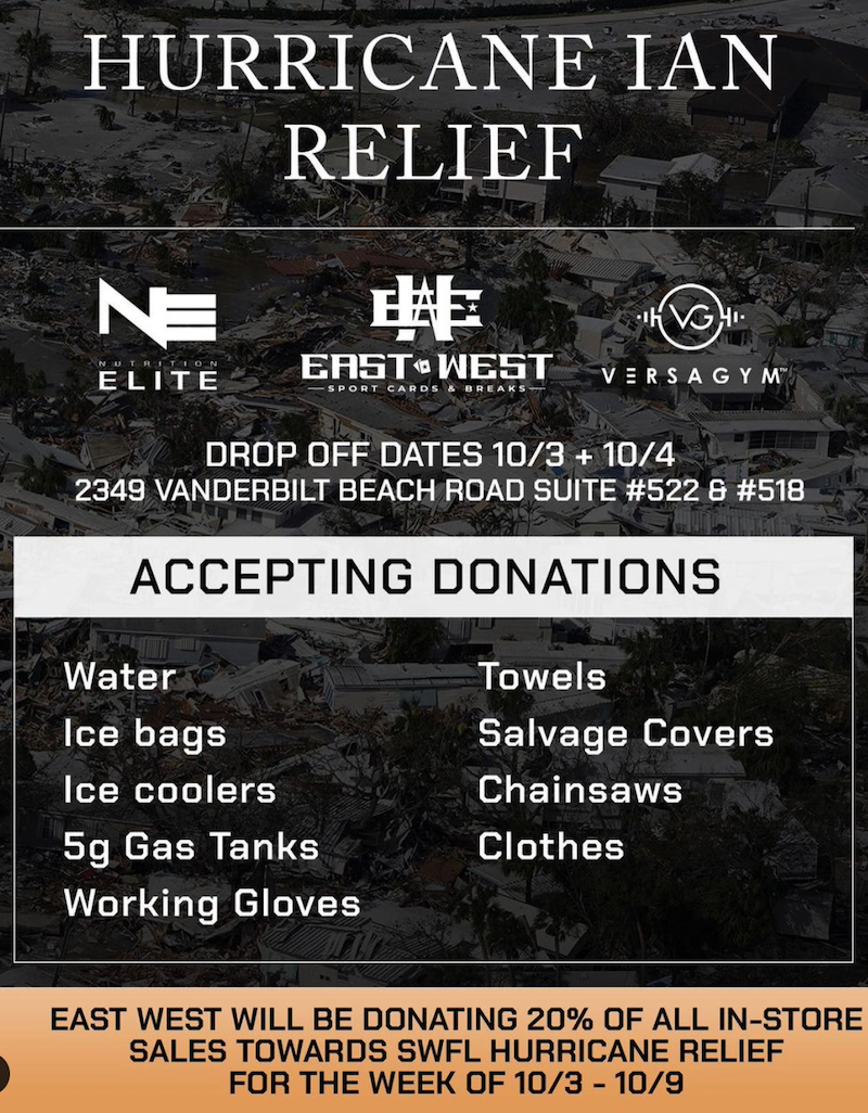 "In support of our community as well as surrounding communities during this time of need, numerous relief efforts are being made. All efforts are in search of volunteers and supplies and will be in constant need for quite sometime," read the company's announcement. "With that being said, East West Sports Cards & Collectibles, Versagym & Nutrition Elite are coming together and creating a designated drop-off location for those looking to donate."
