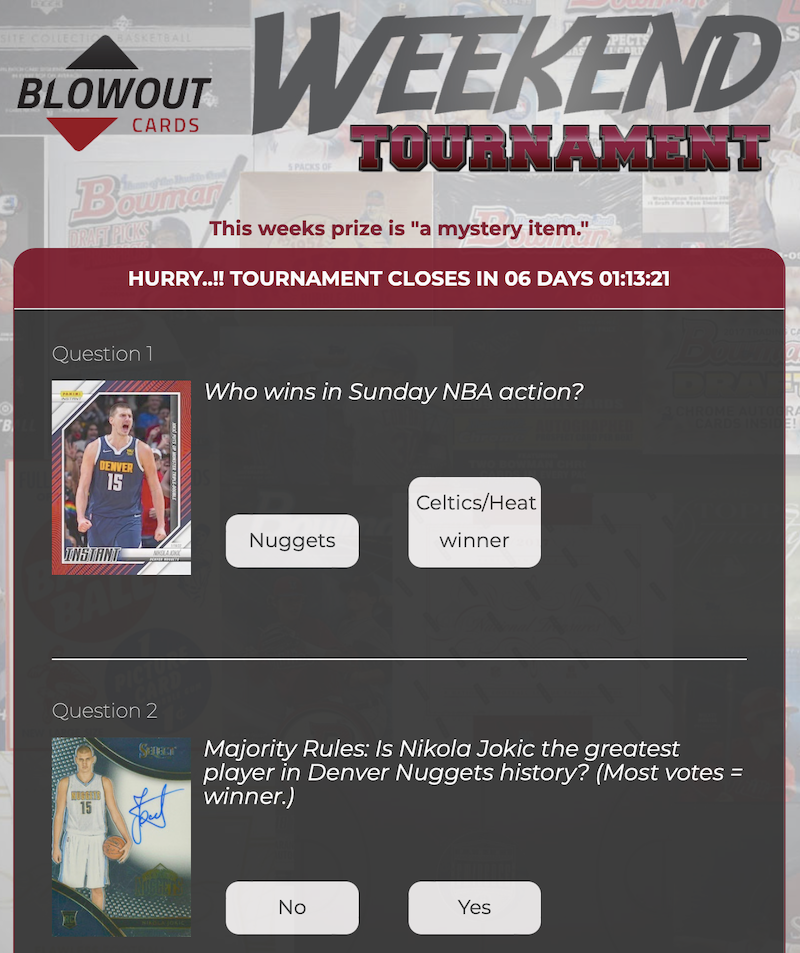 YourDozen.com competition returns with free cardboard up for grabs to one lucky winner -- this time it's a mix of picks for Sunday NBA and MLB action and Majority Rules hot-take questions to go with them.