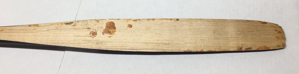 In a nutshell, that sums up this month's item in this Collecting Game-used series. You can see a teaser of what's left of the pice above with pine tar and shards of what looks like maple left behind. Thankfully, while there's a lot of mystery to this one, the identifying side of the barrel remains in play ... and that is why I grabbed this piece for my personal collection.