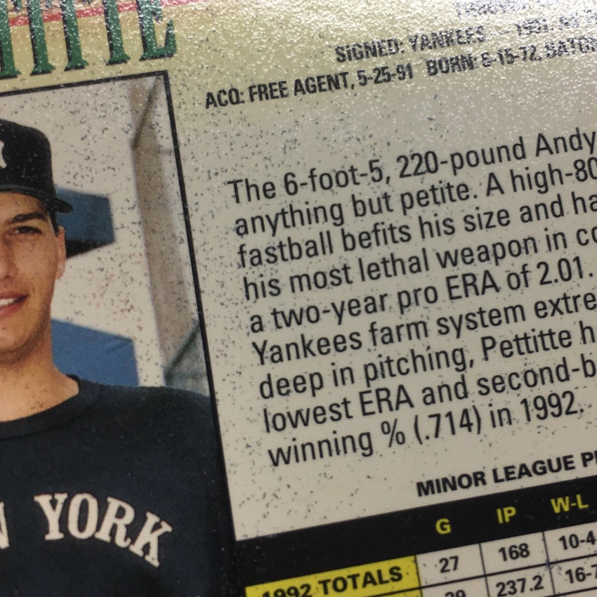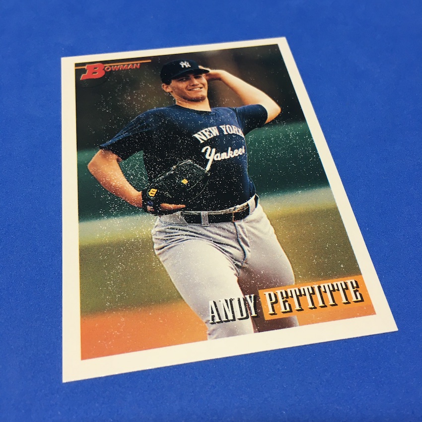 I didn't find The Captain, but I did find another notable Yankee newcomer -- an Andy Pettitte Rookie Card -- that looked like he came straight from Mount Everest. I found a whole lot of snow on that and many other cards here -- but not all of them -- in the $5 pack I just opened.