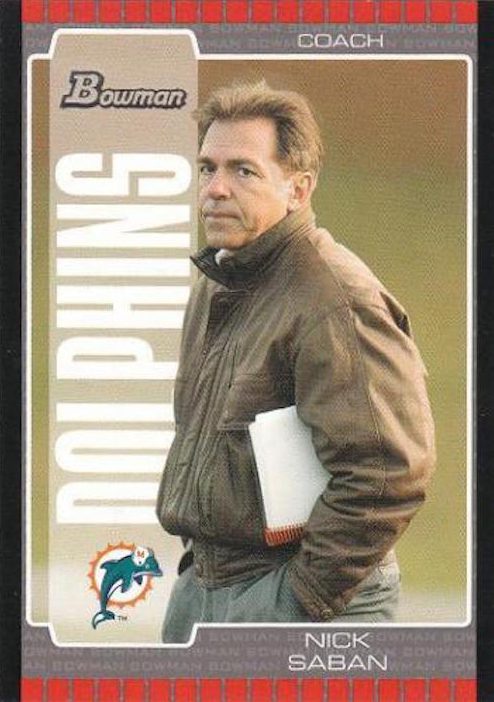 Saban's earliest card came during his brief stint as coach of the Miami Dolphins when the 2005 Bowman set included a number of coaches -- a "Rookie Card" that sells for a few bucks. His autographs typically have sold for between $140 and $175 in recent months with asking prices on rarer and graded copies much higher.