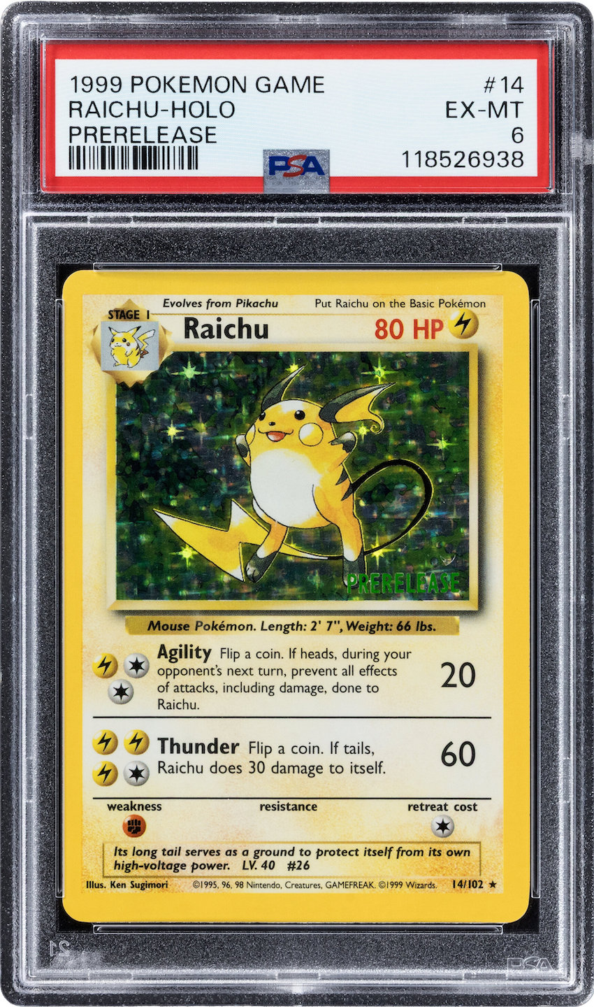The Item: 1999 Pokémon Raichu 14 Unlimited Base Set Prerelease Holo card PSA 6