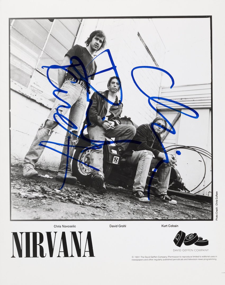 The Item: Nirvana (Kurt Cobain, Dave Grohl, Krist Novoselic) autographed 1991 promo photo (BAS letter authentication and stickered on back)