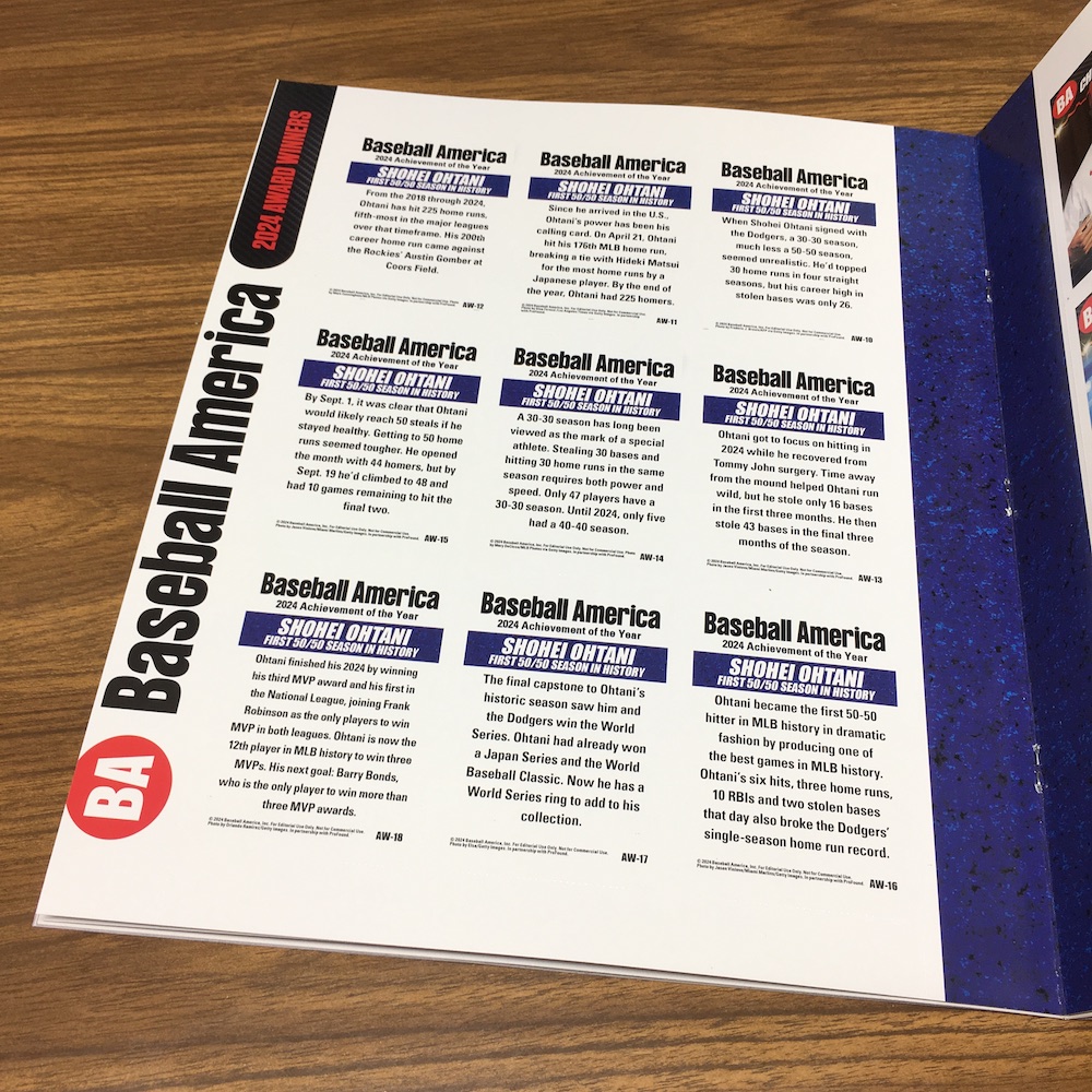 Rounding out the first half of the set? Global superstar Shohei Ohtani -- with nine mini showcases of everything from his signing with the Dodgers to his unanimous MVP award. Here, his 50-50 Club season is Baseball America's Achievement Of The Year award-winner and that's the centerpiece to his sheet.