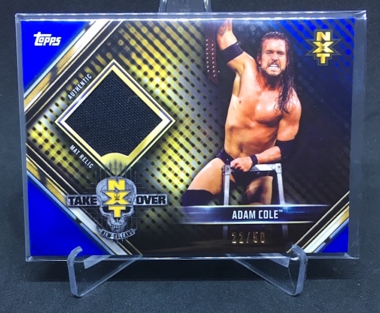 The Card: Adam Cole 2019 Topps WWE Road to Wrestlemania Mat Relics Blue (/50)