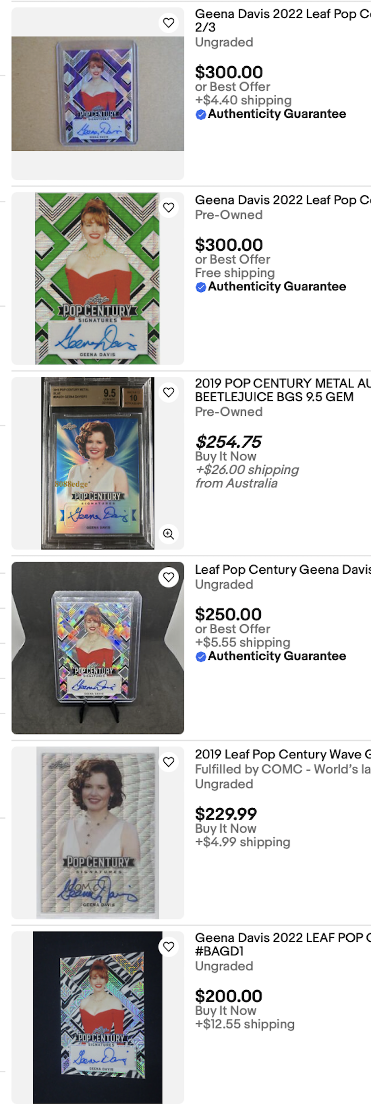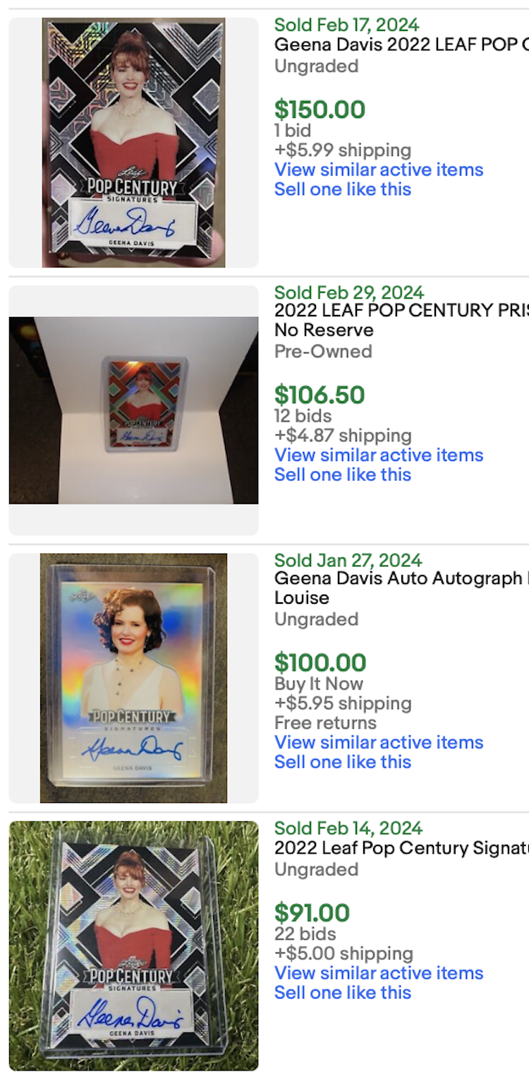 Why it’s Buzz-worthy: She's starred in all kinds of projects and all kinds of genres on both movie screens and TV screens over the years with Thelma & Louise, Beetlejuice, A League Of Their Own, The Fly, The Long Kiss Goodnight, Tootsie, Knight Rider, Fantasy Island, Family Ties, Fletch, Earth Girls Are Easy, Will & Grace, The Accidental Tourist, The Exorcist, Grey's Anatomy, Stuart Little, GLOW and Commander In Chief among them for starters. It's a résumé that also includes her own self-titled TV series, The Geena Davis Show and between all of these projects (and plenty of others) there are plenty of people who know her name and could be interested in some ink. Despite being among high-level projects since the 1980s, she only has certified autograph cards in a pair of Leaf Pop Century releases (2019 and 2022) and not a lot of standard cards in packs, either. However, her autographs aren't impossible finds as she's done private signings for OfficialPix and other dealers, too, in recent years.