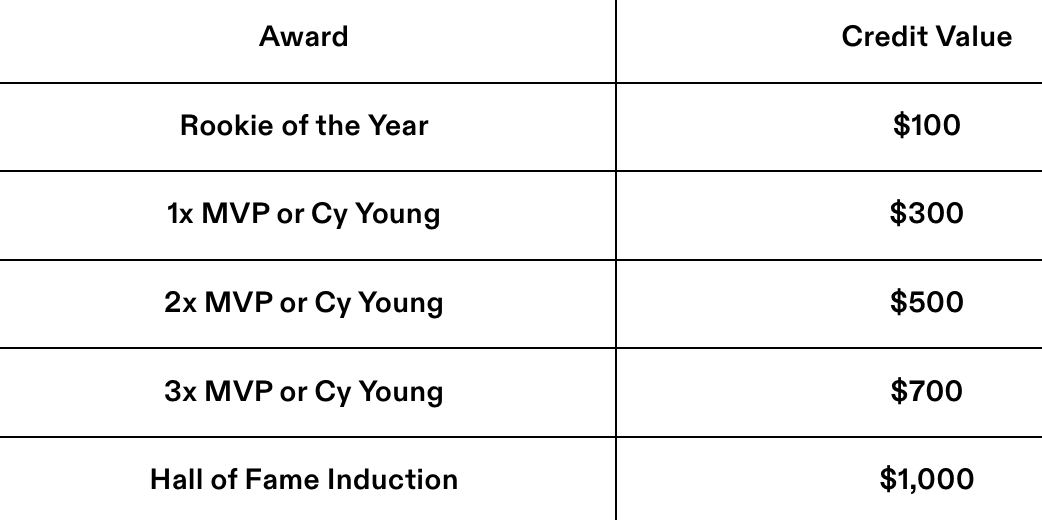 Thirty rookies will be part of the program and if one wins Rookie of the Year then it's good for $100 in credit. Then there are escalators for MVP or Cy Young awards ... and if one wants to collect for the long haul then they're good for $1,000 credit if that player makes the Hall of Fame.