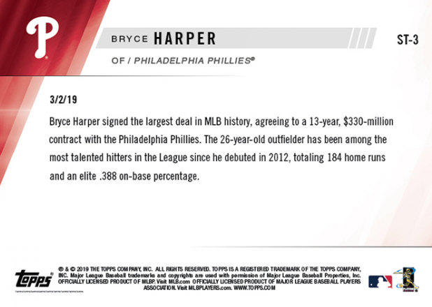Bryce Harper donned his No. 3 Philadelphia Phillies jersey for the first time ever yesterday and today's the day for the first baseball cards reflecting that new reality.