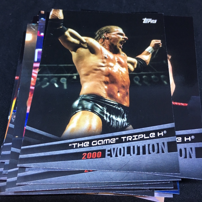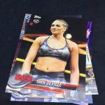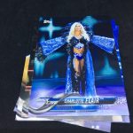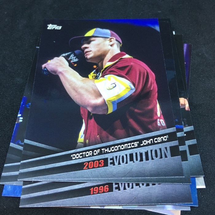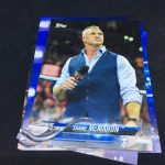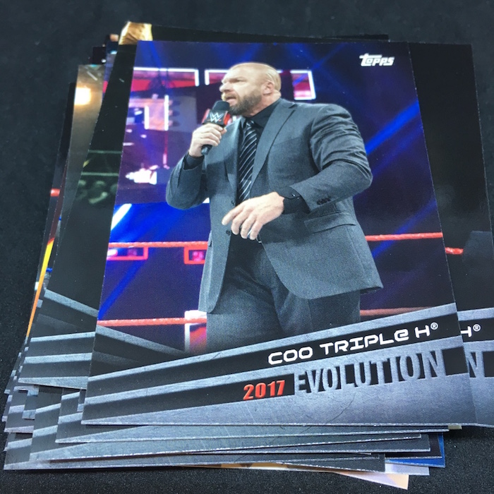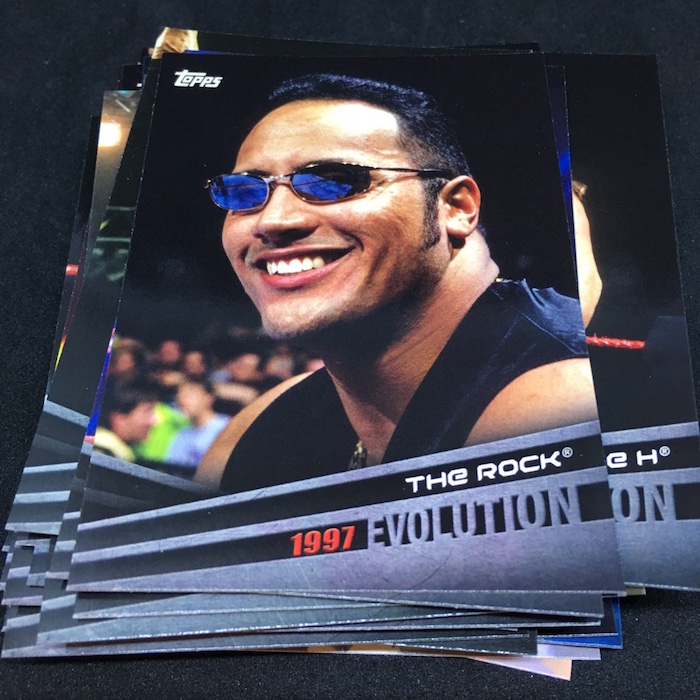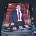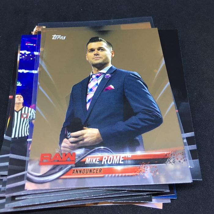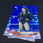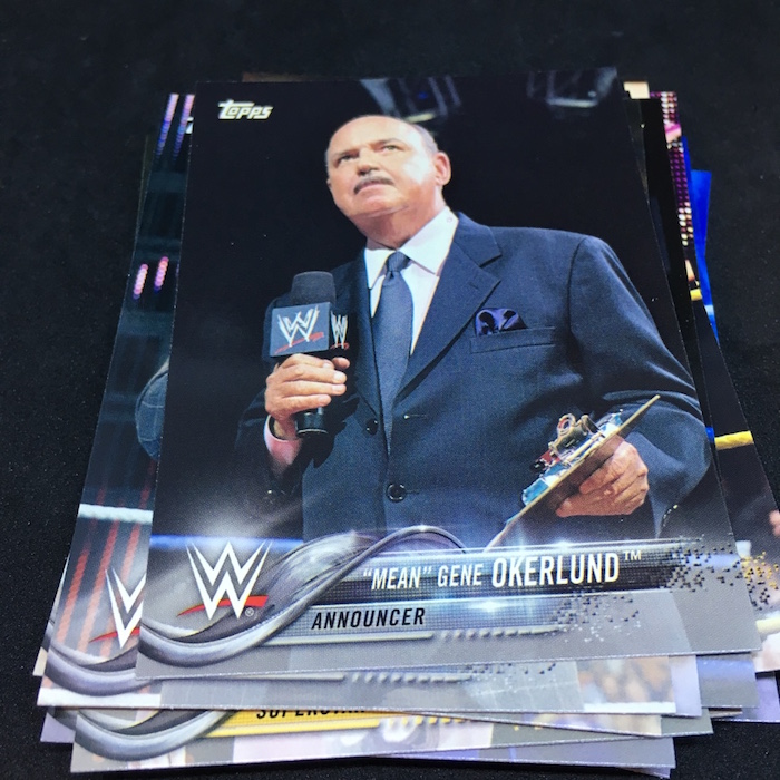 Notables on base cards: Triple H, Stephanie McMahon, Maryse, Elias, Nia Jax, Apollo Crews, Mickie James, Charlotte Flair, Daniel Bryan, A.J. Styles, Shane McMahon, Kevin Owens, Big E, Kofi Kingston, Xavier Woods, Natalya, Carmella, Drew McIntyre, Ember Moon, Johnny Gargano, Andrade "Cien" Almas, Mauro Ranallo, Zelina Vega, Kayla Braxton, Billie Kay, Peyton Royce, Aleister Black, The Rock, John Cena, Undertaker, Paige, Vince McMahon, Lita, Cathy Kelley, Gene Okerlund, Jim Ross