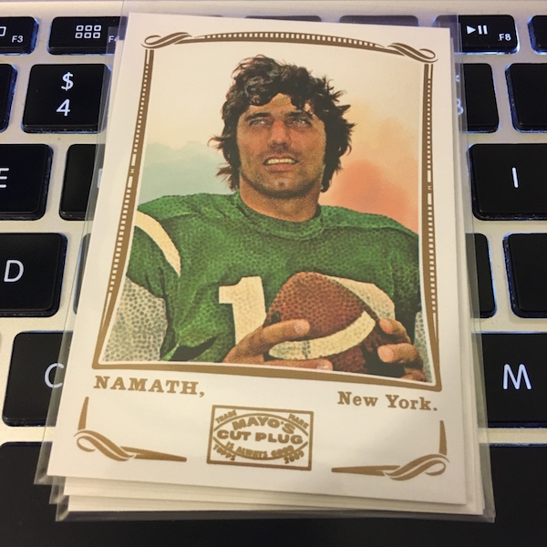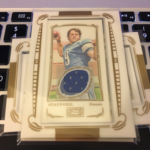 What's Buzz-worthy: This retro-styled football set was the last of Topps' two releases for this brand and it's been on my to-rip list here for a while now. I picked it up in the recent big sale. The first pack included the rarest card in the box -- a cloth card found one in every 192 packs, which is also as rare as the Rip Cards in this one. If you know Allen & Ginter, then you should see what's up here. It's a mix of past and present players as well as some notables from history and it's a nod to the football cards of the same name from the 1890s. The first release of this one was black-bordered while I prefer this one's lighter look because it doesn't showcase card flaws as easily -- at least on the fronts. The card backs here use metallic inks, gold and silver, and you can see the inevitable chips from cutting quite easily. The autograph here was a dud but I love framed mini cards and the Relic was one of the top rookies you can find here and a future Hall of Famer. The autograph checklist included in the box may not be accurate as some might not have made the cut but it's a list that includes Les Paul, Erno Rubik, Usain Bolt, Neil DeGrasse Tyson, Steve Balmer, Ralph Nader, Doris Kearns Goodwin -- no NFL guys yet -- as well as Stafford, Mark Sanchez, Michael Crabtree, Drew Brees, Adrian Peterson, Larry Fitzgerald and Matt Ryan. There are a number of historic inclusions here for cut autos and memorabilia cards -- probably good because the rookie crop here isn't great -- but the inclusion of that and notable NFL stars from the past makes this one I will rip into again. Other oddball inclusions here? A set of governors cards that includes Arnold Schwarzenegger. Arnie wasn't in this one but there was a lot of weird -- check out the gallery for a hint of it. I'll rip more of this one if it's on sale again this fall -- I have a bit of football fever since we're in season.