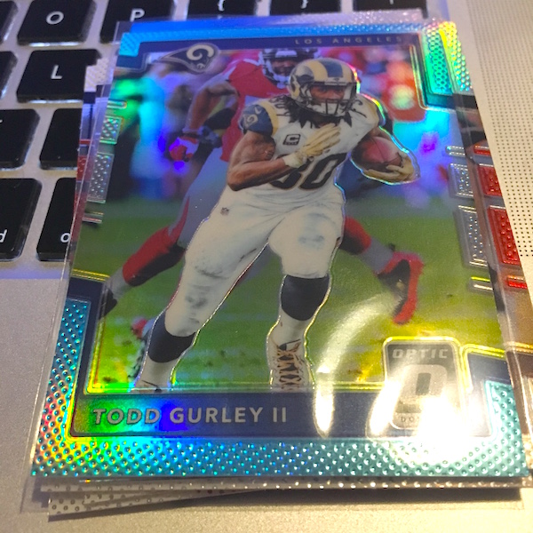 What's Buzz-worthy: If it feels like I've busted a ton of these, it's because it's true. I liked them last year and now they are very plentiful in retail bargain bins, despite a strong rookie crop that includes Rookie Cards for MVP Patrick Mahomes. He didn't show here, but this was an RB box thanks to the hit and some Todd Gurley appearances. The base cards included some top names but the rookies were flat here. ... As said before, blasters don't have a ton of parallels every time but you can land a few colors here and if you land a key guy they will pay for things pretty easily. There are a few formats for this release can be found at the link above with guaranteed ink in some. These Special Edition blasters do include a memorabilia card every time, which seems like a safer rip than standard blasters -- check out the price on the Mega Box in the sale right now at the link above ... that's worth a rip with it guaranteeing even more than this format. For now, this brand seems plentiful but they will dry up and the allure of a Optic rainbow will grow on collectors even more.