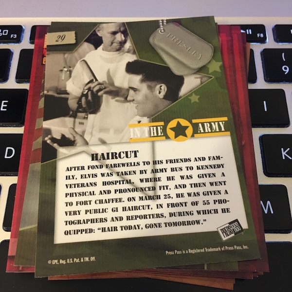 What's Buzz-worthy: This is just one of a few Elvis options from Press Pass and it's one that has delivered very well for this ripper twice with these retail boxes. Years ago, a sealed box at a big chain store seemed like an interesting mystery. It yielded a memorabilia card and a printing plate -- but that was at full price. Now, these boxes are in the big Blowout April Showers sale for a fraction of their original cost and they can still deliver. This one included an autograph of a Rock & Roll Hall of Famer, James Burton, who was Presley's guitar player and worked with plenty of other notables. (He was presented at the event by Keith Richards.) This was his first autographed card -- but he's signed quite a bit for releases to come after this one. Autographs from a few sets combine to be found one in 96 packs here, while memorabilia cards are one in 84. ... The base set here is subset-heavy with a dramatically different look for each card, which adds to the variety of ripping here, helping tell Presley's story from several directions. The inserts here are a little flat -- foilboard montages with quotes and images -- but the total experience here isn't a bad one. For the price, you have a pretty good shot at some type of autograph or memorabilia card and a case break could deliver pretty well on both fronts. There also is an outside shot at finding an Elvis cut autograph -- it's on the odds -- so maybe one of those cases or boxes left contains the big one. You never know.