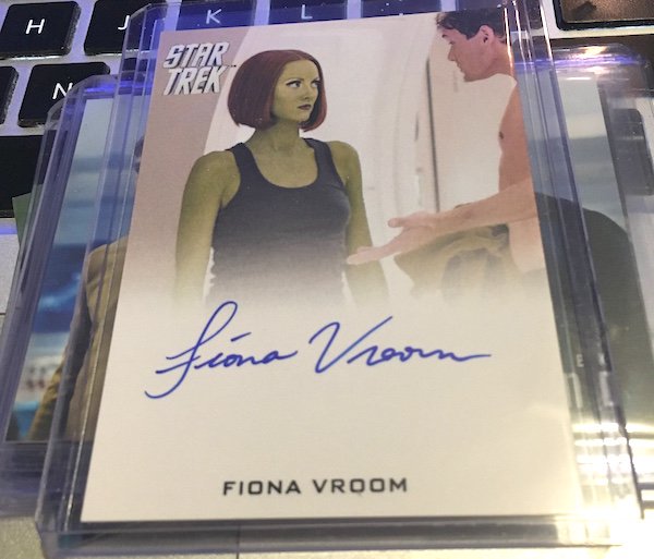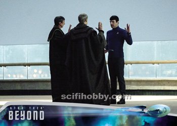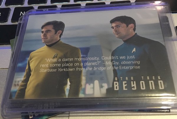 What's Buzz-worthy: This was Box No. 3,102/6,500 and while it was made for a movie that I found a bit forgettable it was a box that delivered big -- in both an auto I'd want and it having a card that's found just once per case as well as in some other inclusions that are, ironically, from the previous movie which I liked a lot. (I guess that makes this one an A+ for me as well as an A+ in general.) The hits here with a definite highlight with the auto Relic being one that was among the handful teased for one of the iconic stars who isn't among the core crew (or in Beyond). The dual card is cool in that it showcases one of the more memorable new characters for the new film and offers a somber reality check that some of the new cast are already no longer living. The metal cards are one per box and a nice touch, while the only other inserts in this box were the Quotables, which have a better look here than in past sets I have seen. The base set is larger than what was initially teased at 85 cards and you get plenty of the colorful and bleed-heavy cards (front and back) here, though there does seem like there could be more variety in a box for sure. There are a number of other possible inclusions in this one on the insert front, but I'm absolutely fine with what I found here instead of those other potential finds. I haven't done more than a handful of Trek boxes and this is my first from the recent wave of films but based on this it shouldn't be my last. And the best part? It was on sale -- check out that link up top.