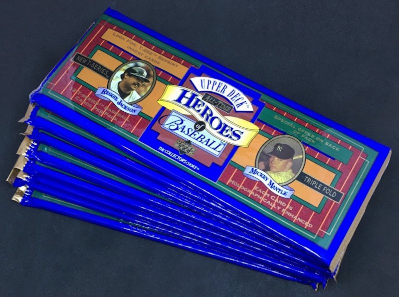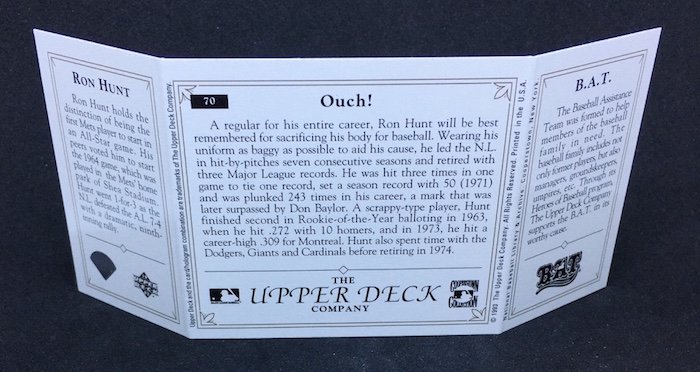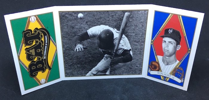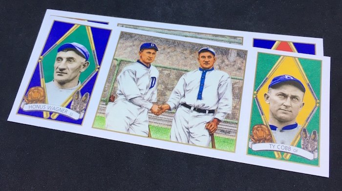 What's Buzz-worthy: The gallery of this one will make you think this one is solely Hall of Famers but it's not -- it's mostly all Hall of Famers but with some others from the past. This set is a nod to the 1912 T202 Hassan Triple Folders set that pairs end cards that carry a T205 design and place them around an image in the middle. Here, they do that with some single-player cards (one panel a nod to the Baseball Assistance Team organization that helps past players in need) and then some combos. They are roughly 2.5 by 5.25 inches and are scored so they can be folded if one wanted to display them that way (that wouldn't help conditions). On some cards here, there's a fantasy grouping of legends from artist Todd Reigle and the outer cards change around them as you work through the set. (They aren't errors or variations as the card numbers change.) The only inserts here are 10 reprints of original Hassan cards and I landed five of them. Had this one had some autographs in the mix? Well, the boxes wouldn't exist today. I found the one for not much more than $1 a pack and it's been years since I last ripped into one. What will I do with it? Perhaps I pick a favorite and grade one (maybe, the fee would be higher since they are larger) or more likely I throw them in a binder along with my stars from years ago. It's a fun set and it's got some non-Hall of Famer surprises like Mark "The Bird" Fidrych, Dave Dravecky and Curt Flood to go with a few lesser names with fun or interesting photos as well as an over-loaded Cooperstown crop. It's not that fun of a box to bust but it's a pretty solid set once you get everything together.