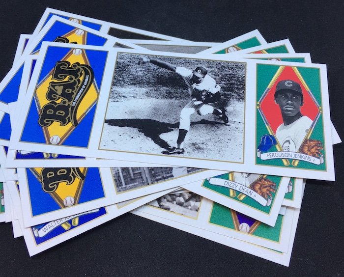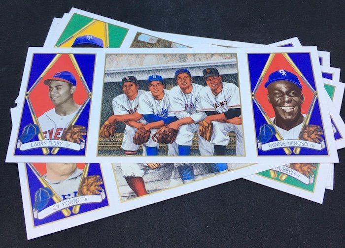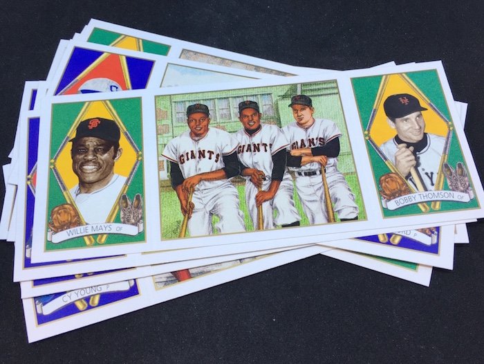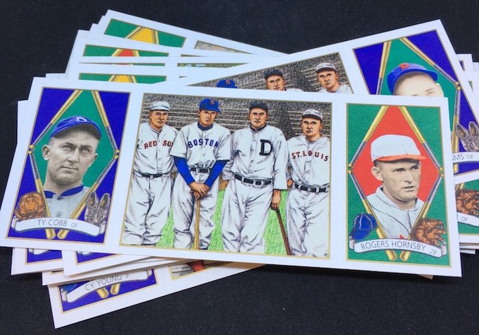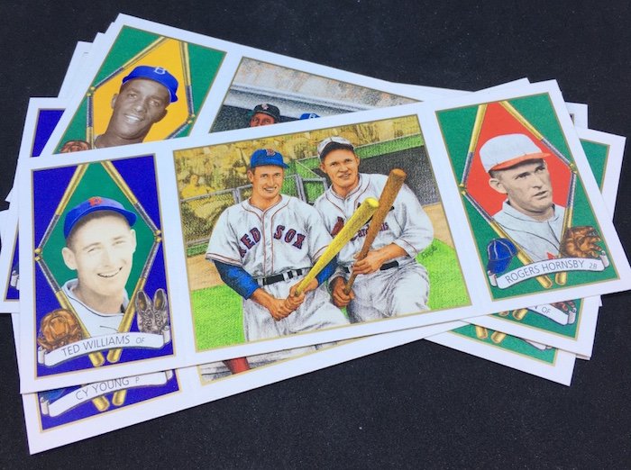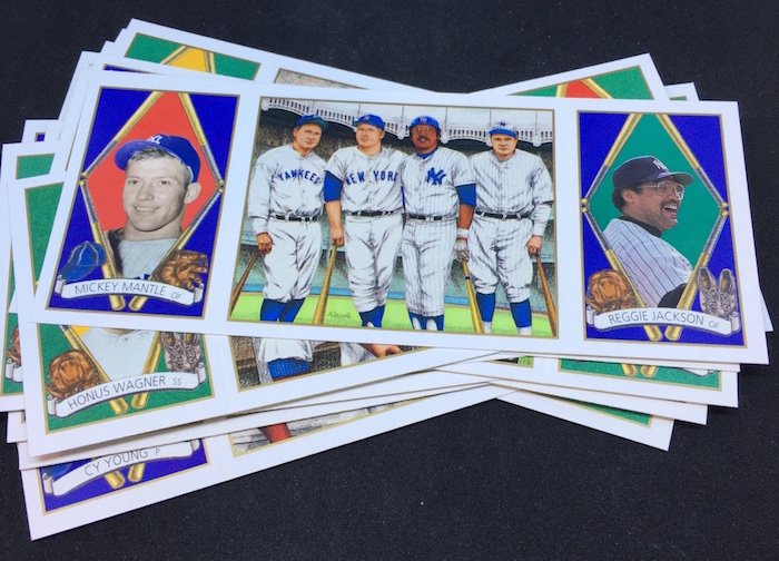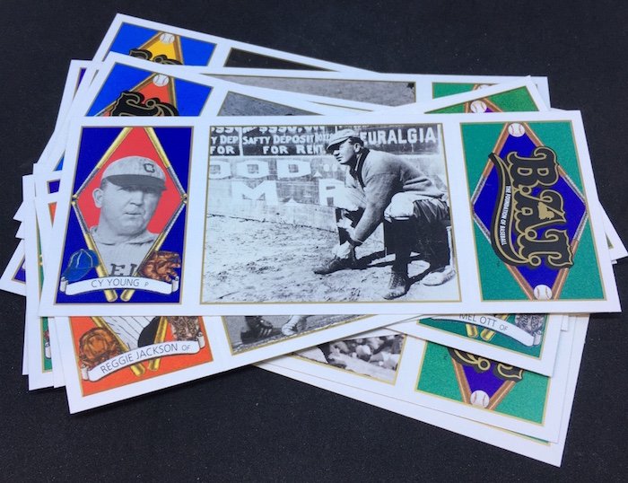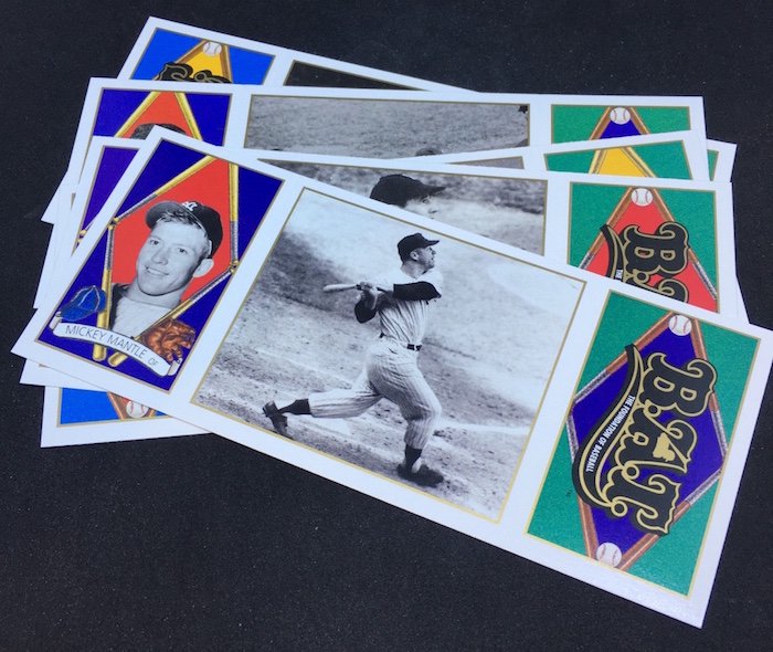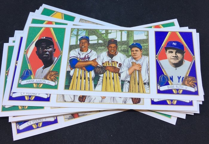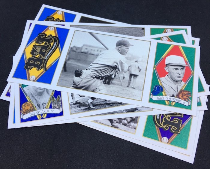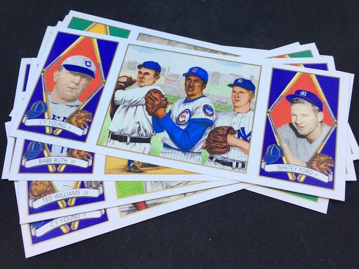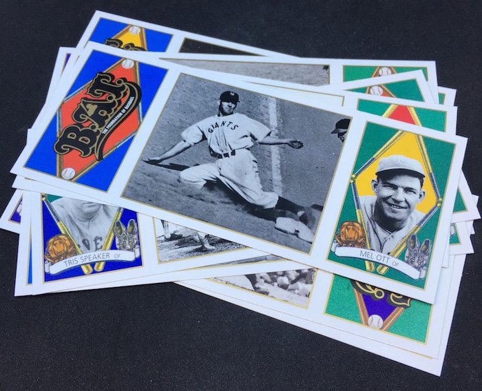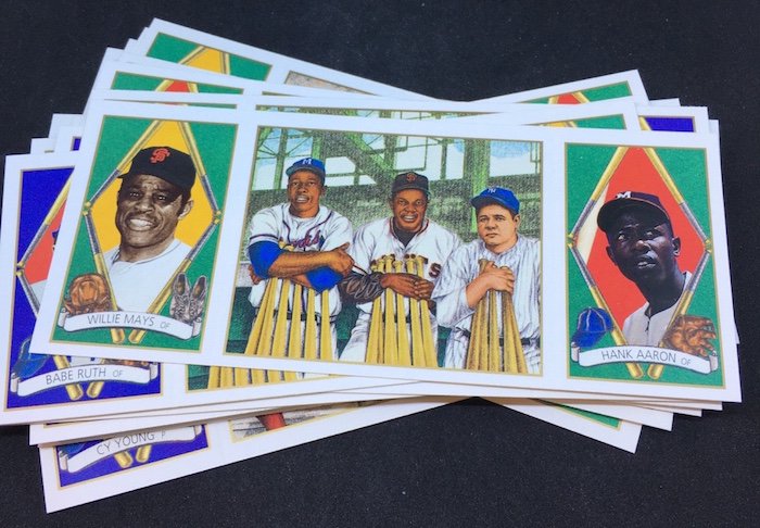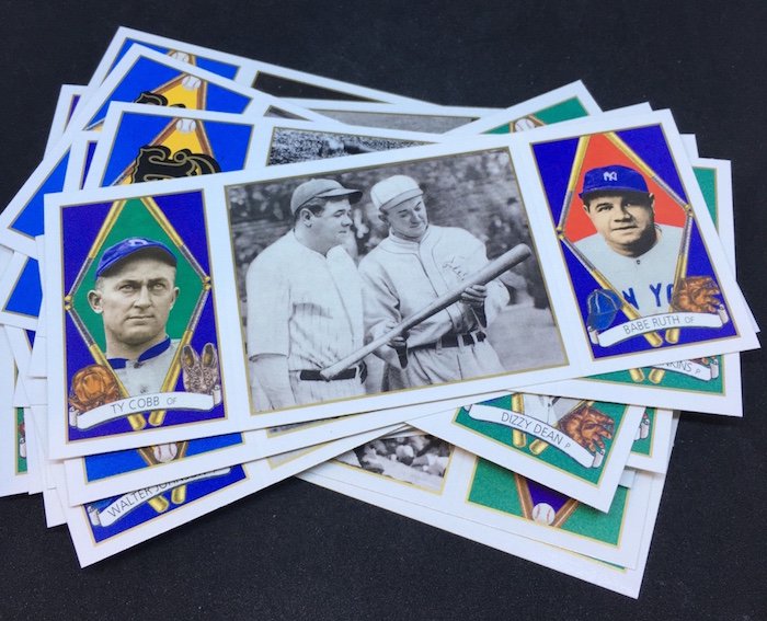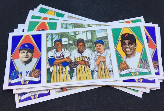 Notables on base cards – Hank Aaron, Willie Mays, Babe Ruth, Mickey Mantle, Lou Gehrig, Reggie Jackson, Ty Cobb, Ted Williams, Rogers Hornsby, Mel Ott, Carl Hubbell, Monte Irvin, Joe Tinker, Johnny Evers, Frank Chance, Whitey Ford, Cy Young, Fergie Jenkins, Tris Speaker, Honus Wagner, Walter Johnson, Bobby Thomson, Warren Spahn, Larry Doby, Minnie Minoso, Robin Roberts, Yogi Berra, Dizzy Dean, Jimmie Foxx, Gil Hodges, Johnny Mize and plenty of other greats from the past.