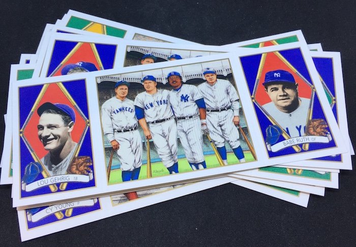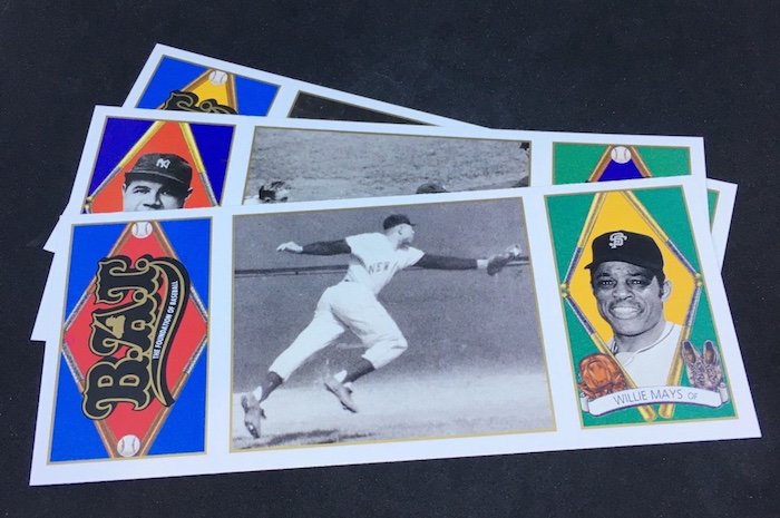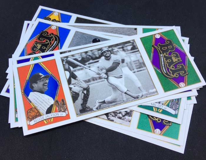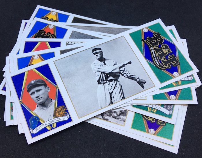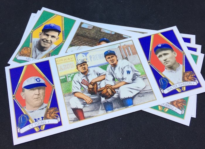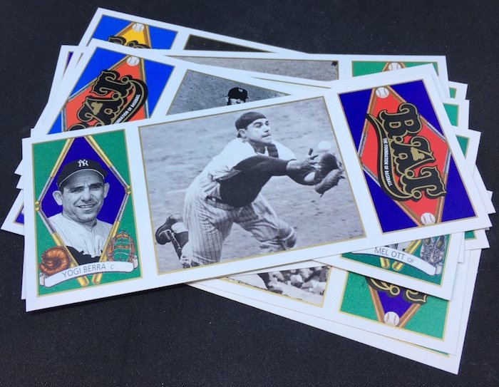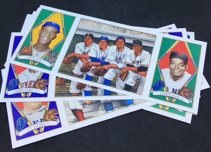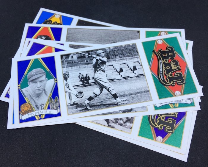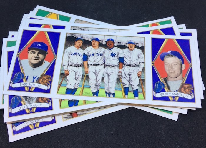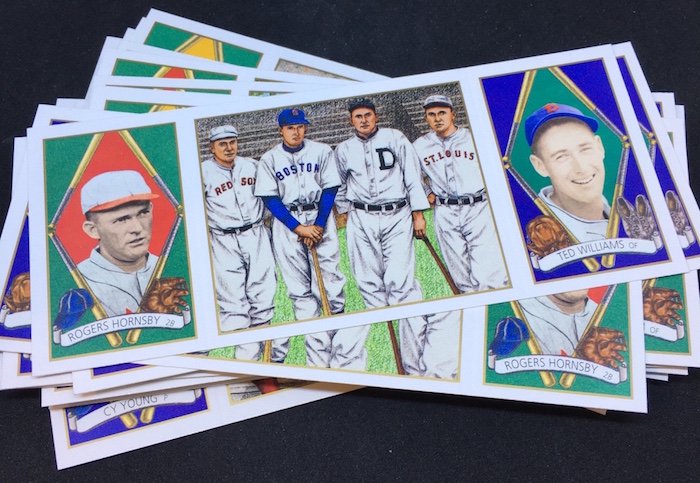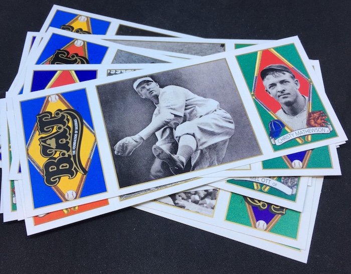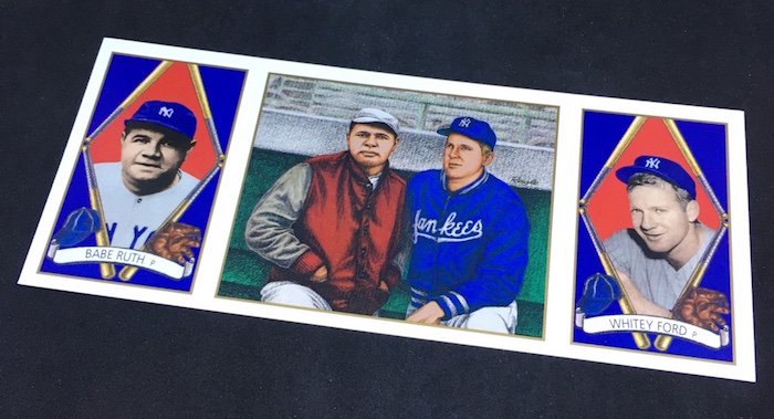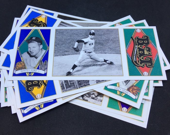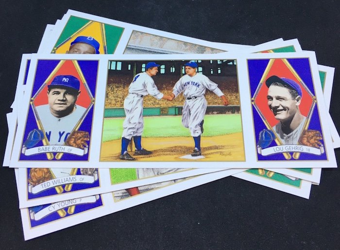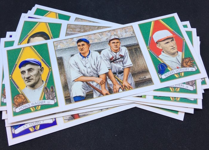 Notables on base cards – Hank Aaron, Willie Mays, Babe Ruth, Mickey Mantle, Lou Gehrig, Reggie Jackson, Ty Cobb, Ted Williams, Rogers Hornsby, Mel Ott, Carl Hubbell, Monte Irvin, Joe Tinker, Johnny Evers, Frank Chance, Whitey Ford, Cy Young, Fergie Jenkins, Tris Speaker, Honus Wagner, Walter Johnson, Bobby Thomson, Warren Spahn, Larry Doby, Minnie Minoso, Robin Roberts, Yogi Berra, Dizzy Dean, Jimmie Foxx, Gil Hodges, Johnny Mize and plenty of other greats from the past.