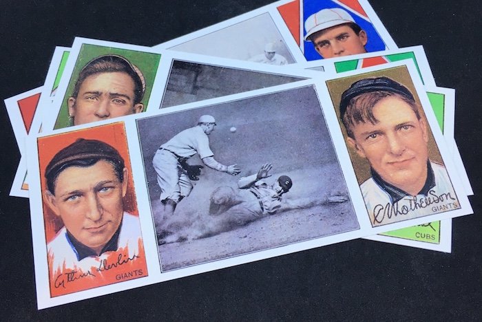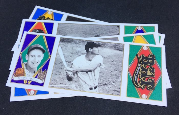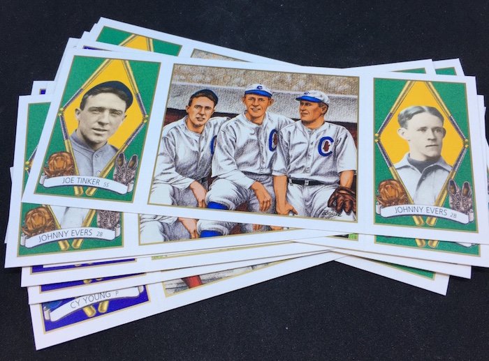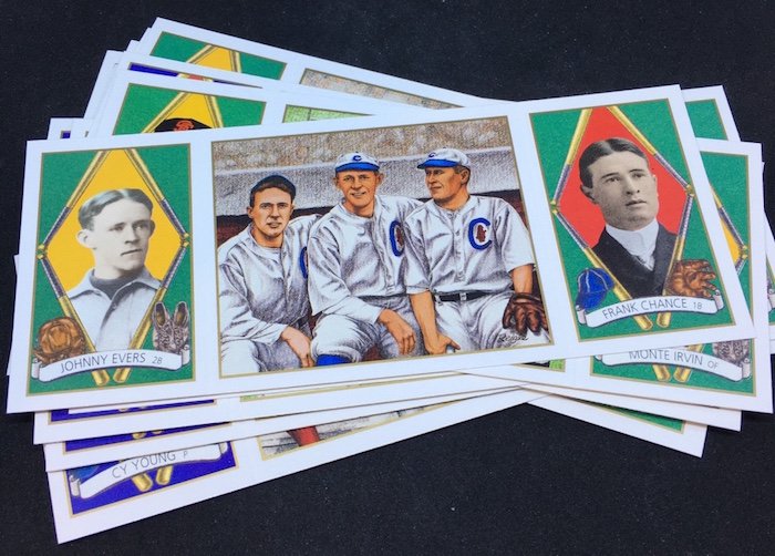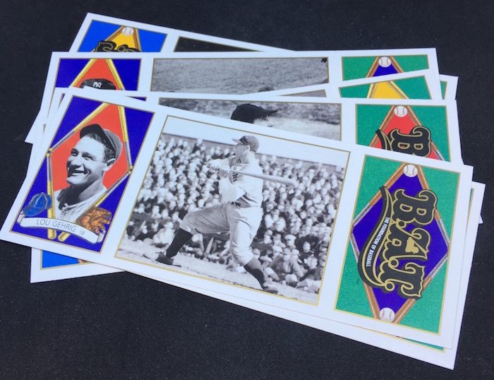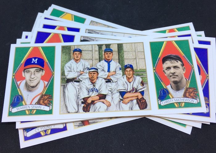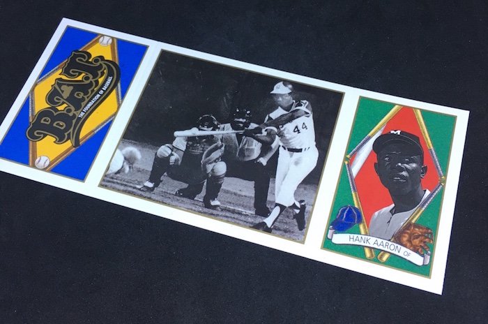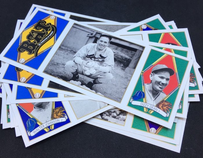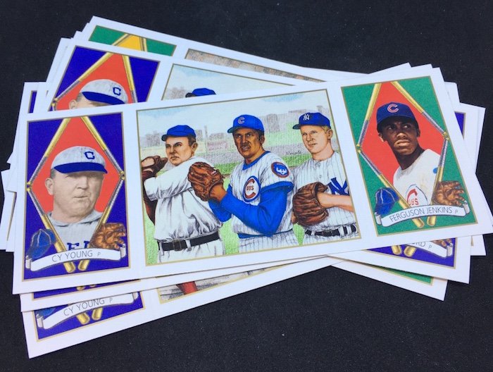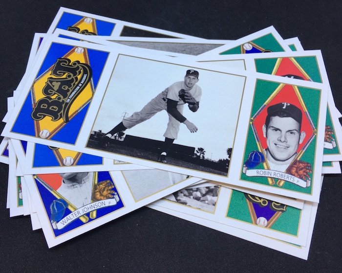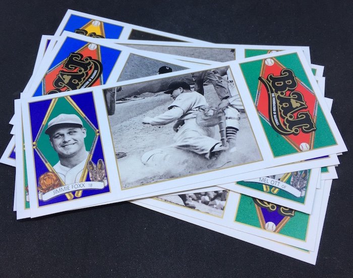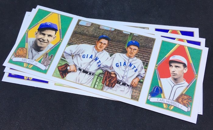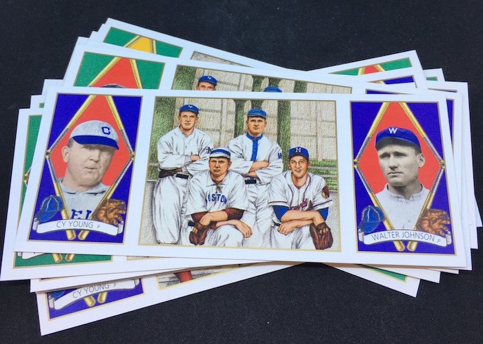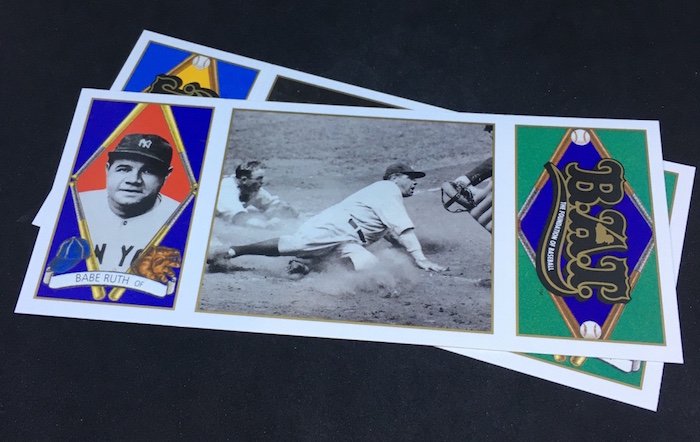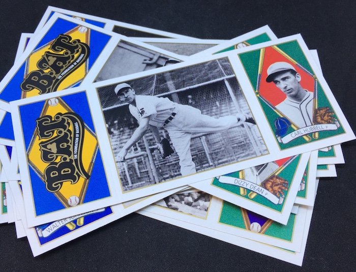 Notables on base cards – Hank Aaron, Willie Mays, Babe Ruth, Mickey Mantle, Lou Gehrig, Reggie Jackson, Ty Cobb, Ted Williams, Rogers Hornsby, Mel Ott, Carl Hubbell, Monte Irvin, Joe Tinker, Johnny Evers, Frank Chance, Whitey Ford, Cy Young, Fergie Jenkins, Tris Speaker, Honus Wagner, Walter Johnson, Bobby Thomson, Warren Spahn, Larry Doby, Minnie Minoso, Robin Roberts, Yogi Berra, Dizzy Dean, Jimmie Foxx, Gil Hodges, Johnny Mize and plenty of other greats from the past.