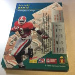 What's Buzz-worthy: Just 8,250 boxes of this one were made -- this being half of a box -- and this was considered a high-end brand at the time with it having an encased autograph in every pack and more of a premium-style pack with one insert and two base cards. The cards aren't ultimately that high-end but these are a tad harder to find compared to the other football releases from this company around that time -- all with an on-card autograph in every pack for around $10 if I remember correctly. (Standard-release packs were around $5-7.). I found these at roughly $1 a pack now, which seemed very low even though many of the autos in this one might not fetch that. There also were autographs for the basketball-teasing Hoopla cards with the best card being a Kevin Garnett limited to only 500 copies. This 50-card set is lean on big NFL names but it includes a few -- ink from Hall of Famers Terrell Davis and Curtis Martin, Green Bay Packers franchise Hall of Famer Antonio Freeman and past college greats such as Jay Barker, Frank Sanders and Eric Zeier among others. The value here? Not high -- but I figured since I dug in hard on SR stuff back then but merely ripped just one (bad) pack of this one back in the day I'd jump on it at this price. My first pack? Freeman auto -- so I knew it wouldn't be a total bust -- but it was a stressful rip as my Davis auto didn't show up until my final pack. There are guys here who don't have a lot of autographs -- and a lot of smaller schools are found here, too -- so there can be more interest here and there than one might think. A few of the names here had a lot more NFL experience than I had thought and some had XFL and AFL time but ultimately there are a lot of names that mean pocket-change autographs now. This was a fun rip for the price, though, and it delivered one of the top two autos. I'll take that.