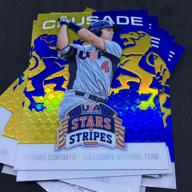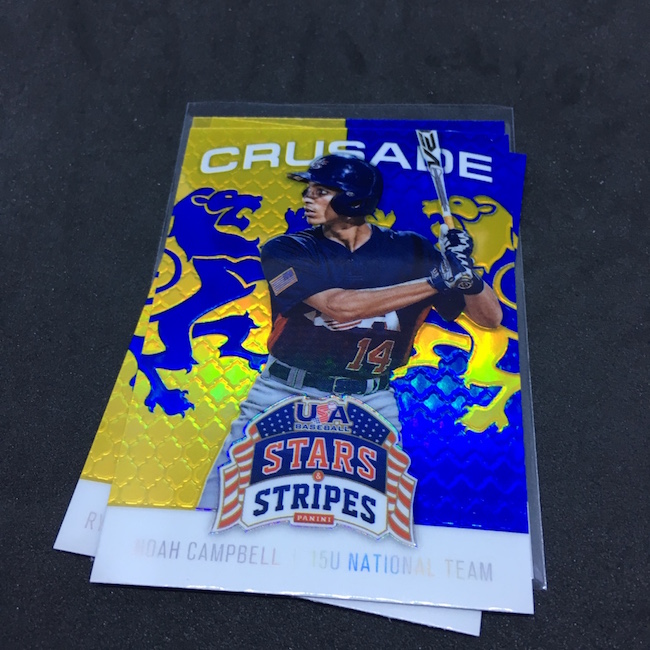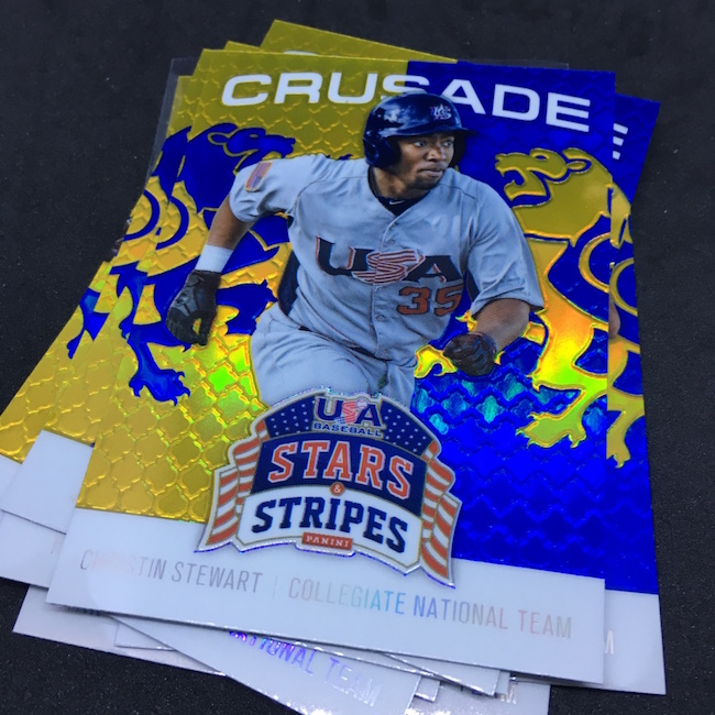 What's Buzz-worthy: I picked this one up since it's seemingly always delivered for me -- just look at those names among the base cards and realize that most of them, if not all, have autographs and memorabilia cards here. This time? Pretty much an average box hits-wise and the only thing that got it a B in my mind was the rare Crusade insert -- I've not pulled one of those before -- but otherwise this one was rough. It's probably my worst box I've pulled of this as ink from all those guys possible. I've pulled Corey Seager and even Kris Bryant patch ink here and a number of impressive patches. None this time. The version of this release before this one was loaded with past names as well as prospects -- with premium card types, too -- while this one is more focused on prospects. For the box price, the potential here is very good and very possible -- it just didn't happen this time.
