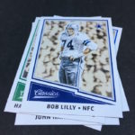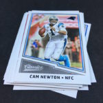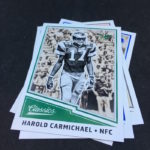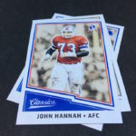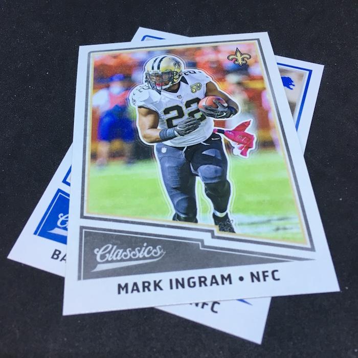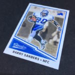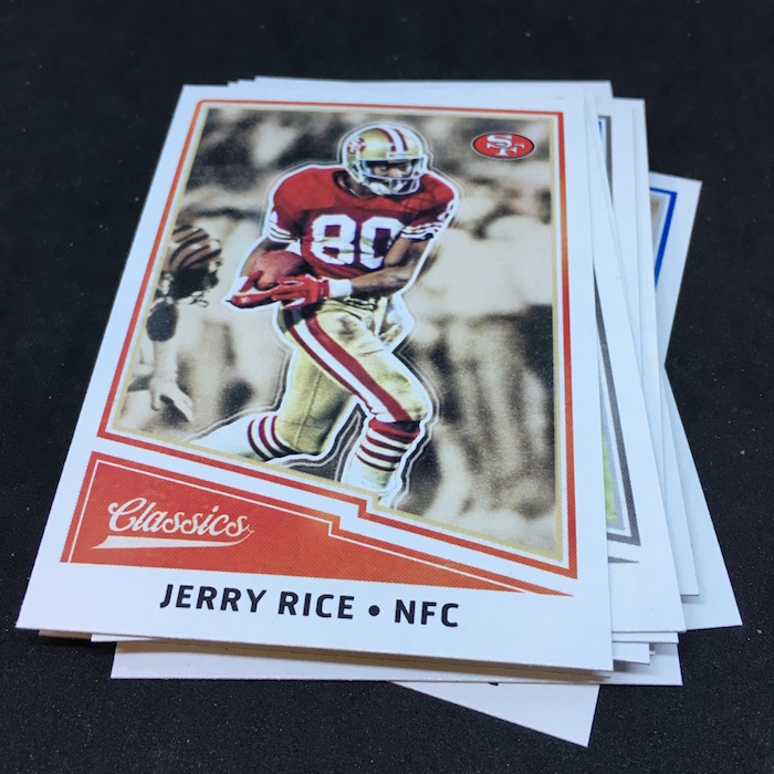 Notables on base cards: Barry Sanders, Mark Ingram, John Hannah, Harold Carmichael, Bob Lilly, Curtis Martin, Dan Fouts, LaDainian Tomlinson, Cris Carter, John Riggins, Kellen Winslow, Rocky Bleier, Andrew Luck, Matt Stafford, David Johnson, Cam Newton, Derek Carr, Khalil Mack, Jerry Rice, Travis Kelce