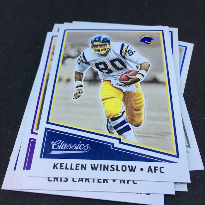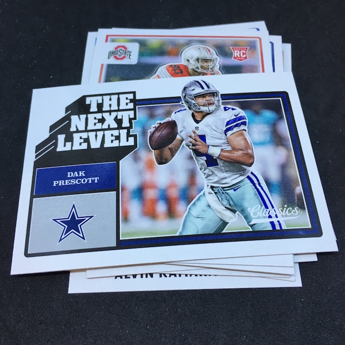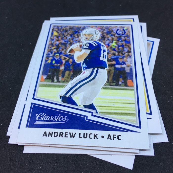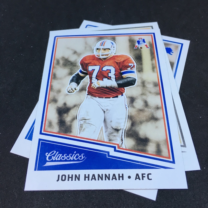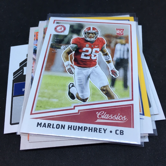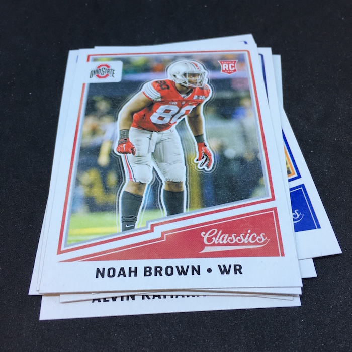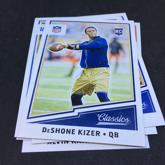 What's Buzz-worthy: It's been a while since I ripped into one of these and a lot has changed since then -- mostly that Patrick Mahomes guy (you might have heard of that rookie) -- but tearing into this box was a reminder as to why I did like this brand a lot in 2016 and 2017. It's one that's loaded with legends, includes a ton of rookies in college uniforms, has a decent (but not guaranteed) chance at ink and has some solid retro feels that are solidly made with a solid mix of players and moments all in one bargain-minded place. I landed this one at original price and was rewarded with ink (albeit on a poorly signed sticker) and then two numbered inserts as well as a pretty solid rookie run but without Mahomes. (He would pay for a box or two on just his standard RC had I landed him.) The overall feel of this box is still an A to me -- and hobby boxes (hit that link above) can guarantee you hits and plenty more of what you see here. My B+ grade you see below is from when this one originally arrived -- it wasn't as good as 2016 in my mind then -- but this is a brand that has aged well because it's simple. I don't even mind the gloss as much now compared to what we've seen since for this brand. ... The model of 100 active, 100 retired and 100 rookies (the rookies are definitely shorter than the other two groups) really works here. The values aren't big-money on most RCs (again, college uniforms) but this one is a very solid product for a collector who likes many aspects of the game on their cardboard.