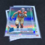 What's Buzz-worthy: These Walmart boxes ($38ish) aren't the hobby mega boxes that include an autograph every time so it's not quite as enticing as that or even their Target counterparts in the past that also carried a higher price. (If you want something similar with more hits at this same price, grab a standard Donruss mega -- those guarantee both ink and a mem card every time.) This particular box didn't deliver a lot of notable names save for a few rookies (and the base selection was actually pretty bad in this one) but what it delivered was a definite upgrade over blasters. Your hit here is a Red & Yellow parallel and those parallel cards are also keys in this format. They aren't numbered but their exclusivity to this one format could make them more of interest over time compared to others and you do get a little more of them here vs. the Pinks found just two per blaster. This box would have been a hit for Bosa fans and it included my third Jones card of the year in almost as many boxes ... but I can say that I've had better mega boxes in the past. If these linger on shelves, they should be considered as there is a good volume here that can lead to good potential if the names all line up in key spots together. It doesn't look like any ink will flow in these boxes, so if you want that hit the other boxes, but if you're just more of an NFL Rookie Card chaser like me, then these are a good place to look.
