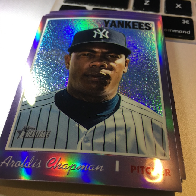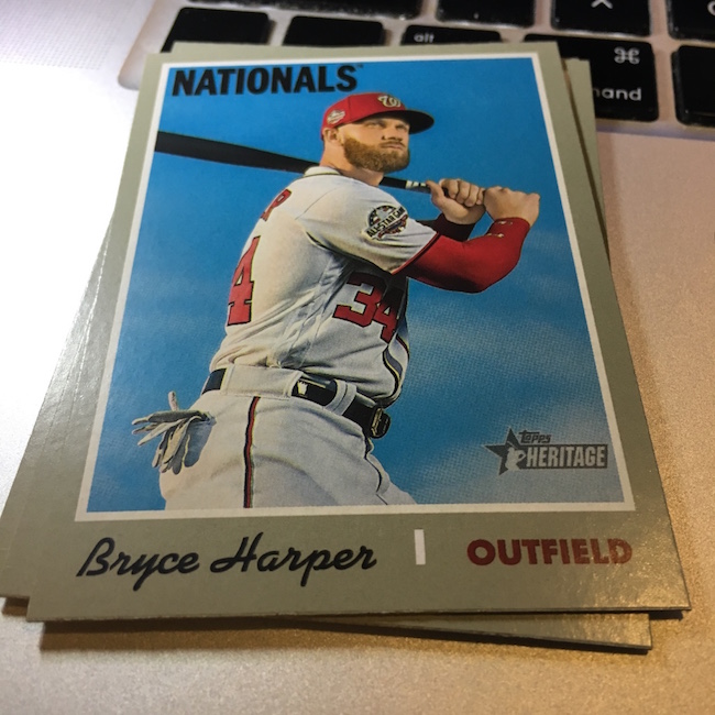 What's Buzz-worthy: The Cardboard Gods out there must want me to break more Heritage as I just followed up my first blaster (which had a hit) with a Hot Box that has a Purple Refractor in every pack. Nothing super-flashy among those but this box was helped with some good names among the other inserts and the short-prints. ... As said previously, the journey back to 1970 begins here with the gray-bordered entrance to a new decade re-presented in great detail. I'll be the first to admit this one departs from what I liked in the 1960s but it's true to the original and it's Heritage, meaning there are plenty of highlights to look for that could and should surprise value-wise (at least early on) because this one is a brand that is collected in full. I won't open as much of this one compared to what I ripped for 1969, but there are a few things to look for here -- Mystery autograph redemptions in hobby boxes for starters. (Vladimir Guerrero Jr? Bryce Harper as a Phillie?) This one will set the stage for a strong Heritage High Number set again this year, too. All in all, 1970 is far from one of my favorites, but this release is strong.