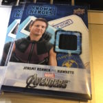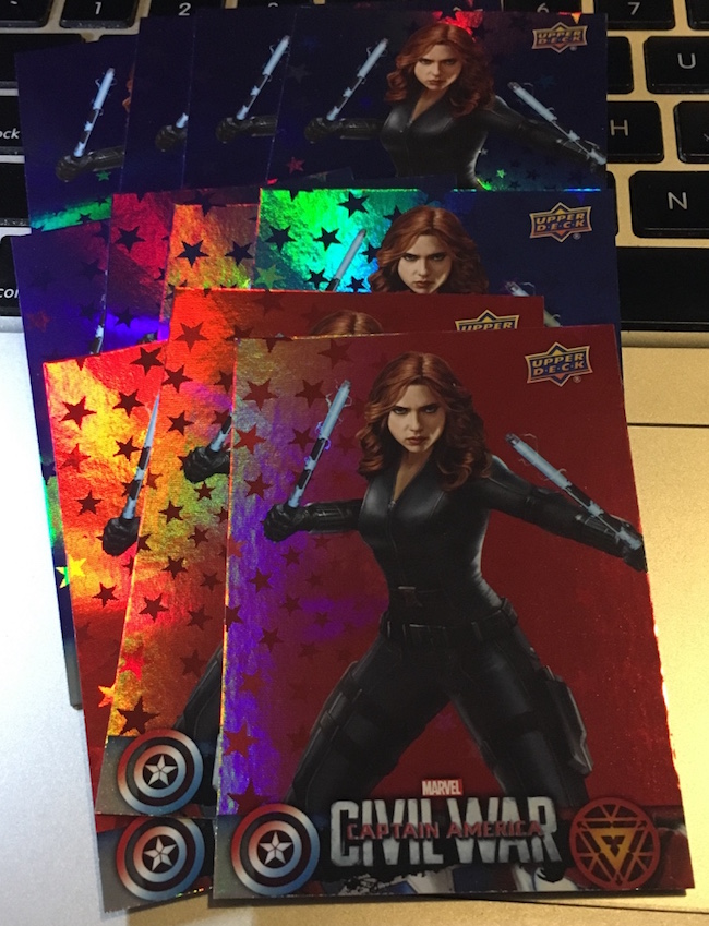 What's Buzz-worthy: This release was made specifically for Walmart and a typical pack includes four cards from a 50-card Red set, four from a 50-card Blue set that's identical save for the color and then a foil parallel for each one. For packs with hits, a few base cards were dropped out. The only other cards to find here besides the Known Heroes memorabilia cards from a number of Avengers-releated films? A one-in-240 Movie Images insert that I didn't land. Memorabilia cards are listed as one in six packs here -- so statistically 36 hits per case but this one over-delivered with 41. I got all but three of the standard memorabilia cards in the set here -- just missing on a Rhodes card, a possibly very rare Falcon card (his only one) and a Captain America from Age of Ultron. (I broke them down by movie above since there were so many in some instances and then multiple poses of the same characters atop that.) These were very repetitive across the board -- partly due to a small set being here four different ways all in one spot -- but at its sliver of original price it was a fun rip. I literally bled popping these packs (torn cuticles from splitting their cardboard hangers), but I'd probably do it again because it was that good of a bargain and these parallels have something of a Precious Metal Gems feel to them. The memorabilia cards have a dark bottom edge so grading there might be too big of a challenge, but I'll probably be checking some of those parallels to see if they are grading worthy. This was a fun volume rip and the only bummer is that I came up two hits short -- and it would be interesting to see if the rarer hits here hold up on another case. This one was very streaky and I'd love to see streaks the other way for some of those characters. If that can happen, these could deliver even bigger than this one.