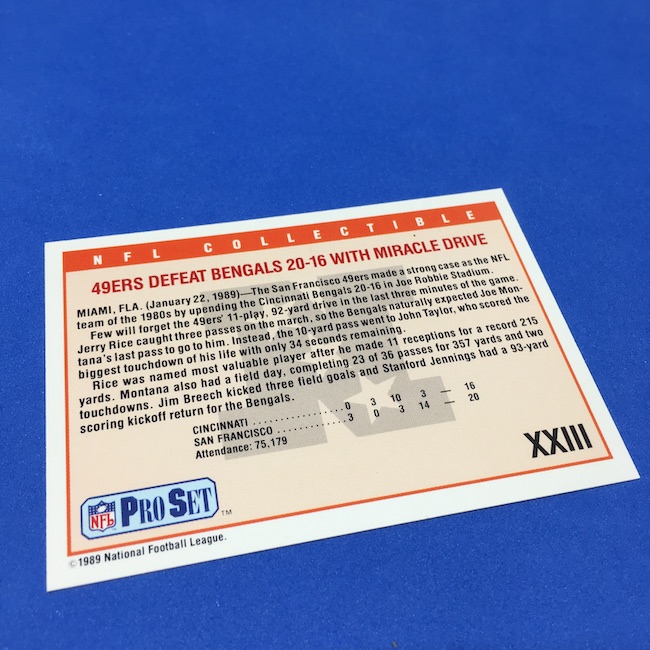What's Buzz-worthy: This one was a cheaper find long ago -- perhaps because it was three packs short of a box -- but that doesn't really matter as there are no true box guarantees, box seals or even hits in this era ... and in this debut Pro Set NFL release that was the start of a new era and all you have to do for one comparison is put these packs/cards side by side with 1989 Topps and compare them fronts and backs. Simply put, "the Future" arrived for NFL fans in 1989 Pro Set and 1989 Score after decades of wax stains and old-time cardboard. Atop all those changes, this one was the start of a "living set" mindset, meaning the set would update as errors were found and fixed as part of the (never-ending) print run, updates of cards in the second series and even a third (tiny batch) series issued as a pack-sized set but also seeded into some packs here and there, too. The collation in this box?? Bad ... but not unheard of ... just look at the Super Bowl inserts (one per pack) where I landed 13 of one and 15 of another -- and there are 23 possible in that set. Series 2 is much, much stronger -- and worth the look -- as those boxes have Series 1 cards in them, too, with some new draft picks seeded into those -- and that crop includes Barry Sanders, Deion Sanders, Troy Aikman, Derrick Thomas, Andre Rison and others ... and a lot of variations to chase, too. (Some can be big-money ... and everything here can be in more demand than you might think in an elite-grade slab.) ... So, who didn't I find? Thurman Thomas (RC), Mike Singletary, Jimmy Johnson, John Elway, Warren Moon, Tim Brown (RC), Dan Marino, Lawrence Taylor, Reggie White, Rod Woodson (RC), Ronnie Lott, Jerry Rice, Steve Young, Joe Montana, Bo Jackson, Eric Dickerson ... and plenty more. Even worse? Not much on the error/variation front ... and what I did land were corrections, though not many and certainly not the rarer William Perry card that was pulled from production. (That's still one of the big finds but other rarities between the series' updates might shock you if you go look.) This one was the start of it all -- and I think 1990 and 1991 are better -- but with other drawbacks. This one was the one this time for a #TBT break. Will there be more? Maybe ... but nothing's planned at the moment.