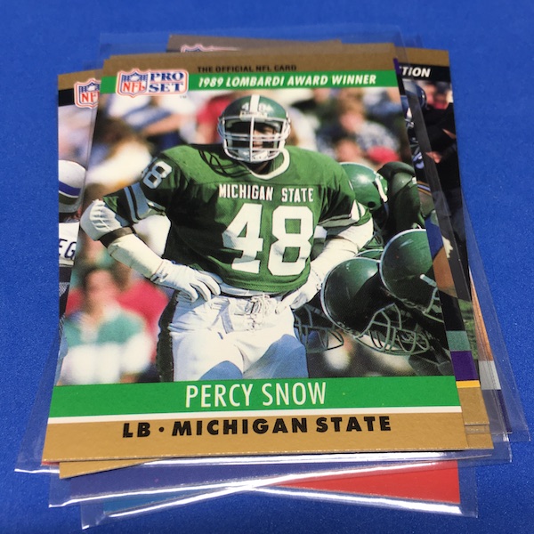 What's Buzz-worthy: This batch was the last of a pack lot for some #TBT Buzz Breaks here and, well, it surprised me as the printing and cutting on these was among the cleanest I have ever seen for this all-timer of a set. Normally cards here are found right out of packs with rough cuts on edges and shards of cardboard everywhere ... especially if you dare to penny sleeve 'em without extra-large sleeves or care for details. (Does it matter? Only if you'd dare to grade notables here ... and I might, so that explains some sleeves in the gallery. Why grade? Top marks are not easy ... and could be in demand to those looking.) ... There's a lot I could say about this one as I think it's an all-time great of a set released between two series in packs and then a small "Final Update" set released in a jumbo pack of its own. I've easily opened hundreds if not thousands of packs (it's thousands as cases had 720 and I've done a few ... and here's 1,000-plus for Series 2 alone) since back then and this one was easily a dominator in its day with errors and variations, cards pulled from production, insert cards like the Lombardi hologram and more inside often. Some of the names you may not know in the gallery have variations that can be tough like the Fred Marion card. Others are simply interesting updates to cards as a "living set" philosophy was used here -- if cards needed to be fixed or updated they would be among various printing waves or even in the second series. The photography here was unlike anything seen before for NFL releases, too, and the design was one that showcased things well with team colors to help sorting and set-building as most everything is grouped together quite well. A lot of today's chase and inclusions prompting people to buy more than one box, in my mind, can in some ways be linked to this release which was packed with a ton of stuff. This small lot doesn't really do it justice -- and Series 2 would do it better -- but this was a fun one for many.