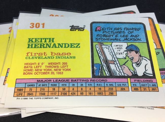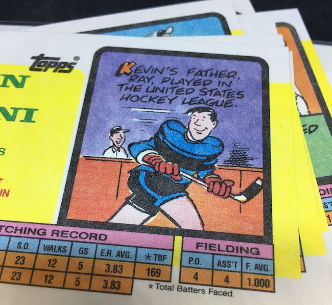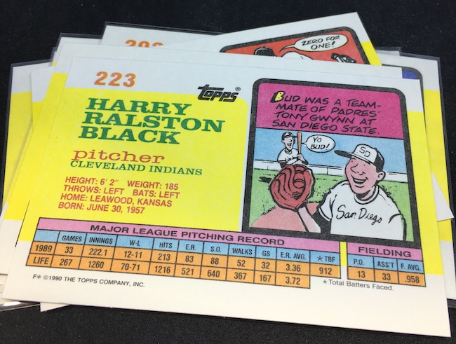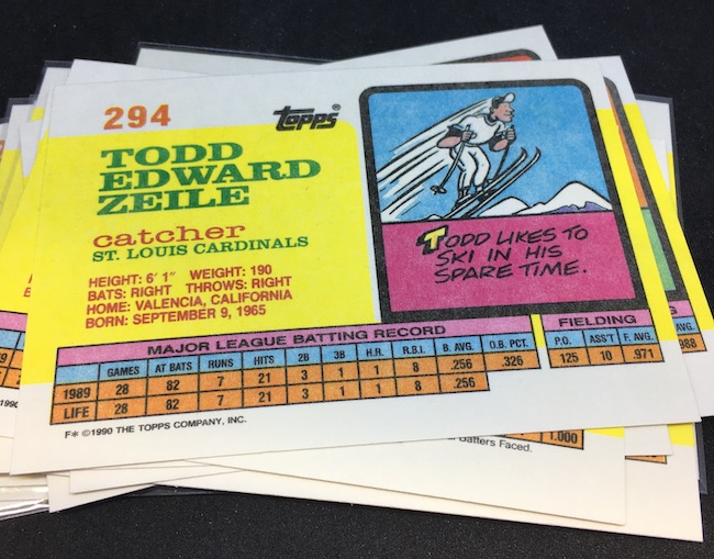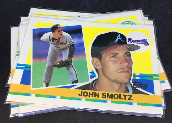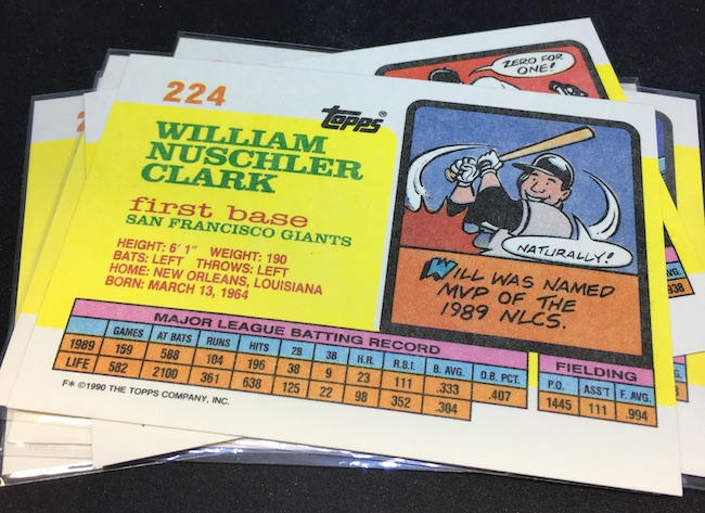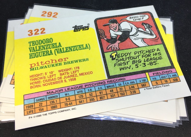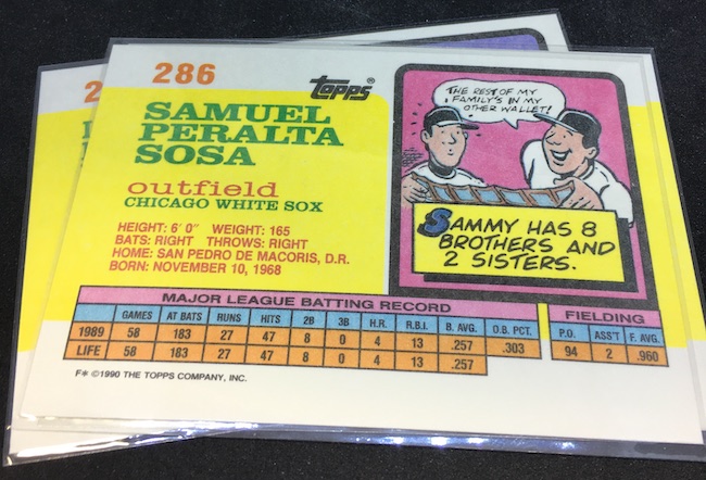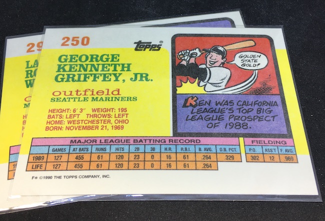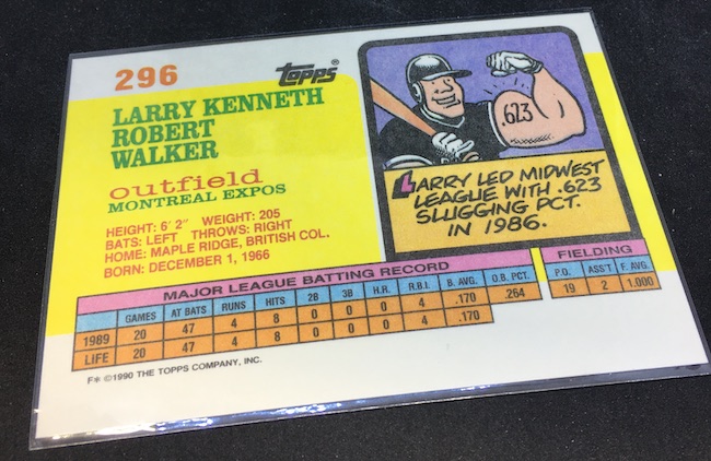 What's Buzz-worthy: Why rip this one? Well, it's a super-cheap box -- less than 70 cents a pack for me this time -- and there are some notable second-year and Rookie Cards here that are overlooked if you ask me. (It's a standalone brand yet reference sites out there don't give them RC tags ... just saying. It's overlooked.) Larry Walker, Sammy Sosa, Ken Griffey Jr. and John Smoltz are key cards here and I actually don't think I ever saw these let alone opened a box back in the day. This was the third and final series in the second year of the run for this standalone brand which was one of only a few to arrive back then beyond flagship, let alone get three series per year. (Most stuff was boxed-set material in 1989 and 1990 with stuff like Stadium Club showing up beginning in 1991. The only thing somewhat comparable as an in-pack product was 1990 Bowman MLB. This, to me, further reinforces that these are RCs that are overlooked in comparison to flagship and Bowman.) These cards are larger-format releases like 1956 Topps with 110 cards per series -- so these are 221-230 on the checklist -- and there are few, if any real variations to chase here though all cards have different sheet notations in the fine print -- either an F* or E* on the copyright lines. (This box was all F* versions ... and I'm not sure anybody would really be trying to collect 'em all that way, anyway.) There were nearly two complete sets here and if your'e a grader the skinny stock and packaging won't do you any favors. The card backs are basic but colorful by Topps standards for 1989-1990ish with cartoons and full names that add to some of the oddity that is this one. Don't be surprised if one or two of the cards from this show up in slabs from me right here in Making The Grade in the future.