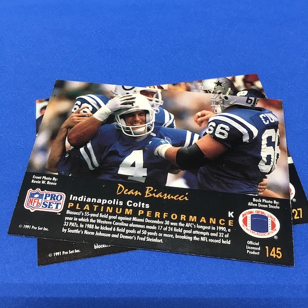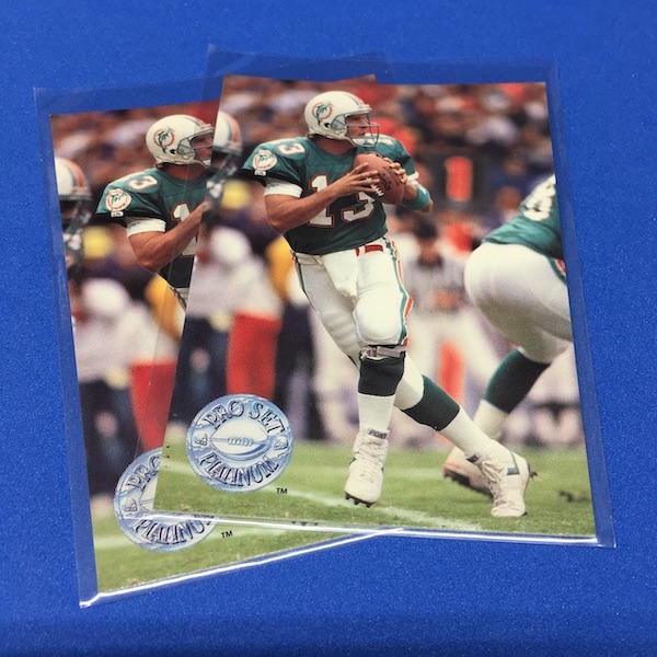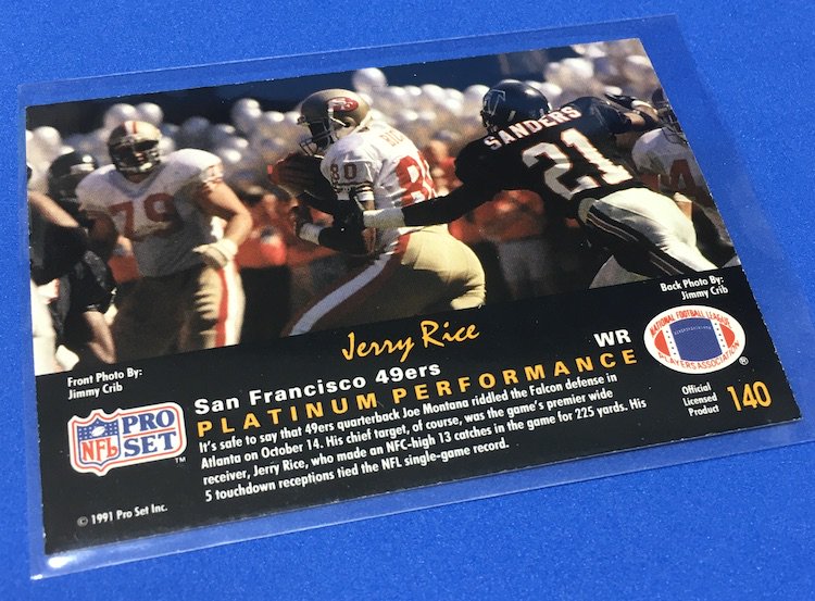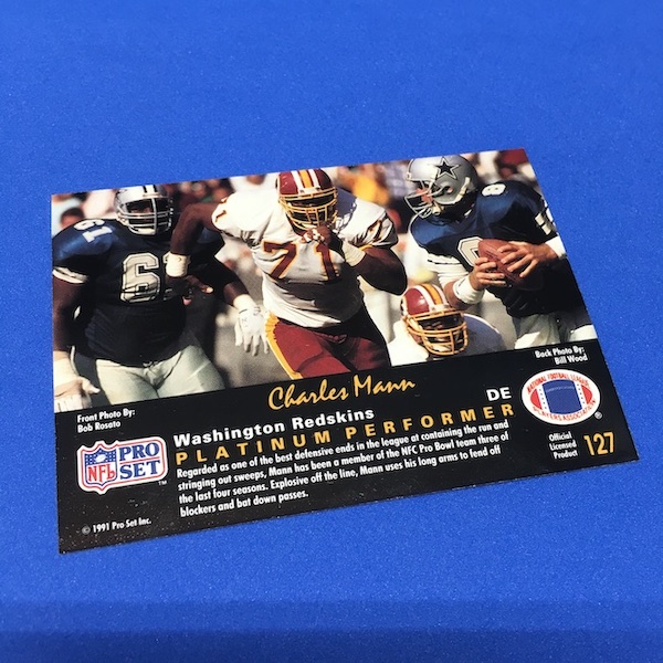 What's Buzz-worthy: Imagine a product with no Rookie Cards, no inserts (at least found on a regular basis in a box or case) yet with a premium feel (for its time) and cost ... welcome to the exploding football card landscape of 1991. Why did I rip this? Well, I recently grabbed a mystery box of old football packs with some simple, Throwback Thursday-style retro Buzz Breaks of single packs in mind but it turned out to be a box of several packs from about five products in just a couple of years -- my prime NFL years, really, back in the day, but, overall, the box was a fail. So, I'll do just a handful of breaks of a few packs and this one is the first. What did I like here? The clean approach and really good photos -- you can see all kinds of small details like what kind of cleats Dan Marino wore, for example, in photos that are bright and sharp. You can see details in the action perhaps not like in other sets -- on both the fronts and backs -- and it's something that I think today's sets miss more than they hit. In fact, something interesting to me here is that photographs get credits on the cards ... you don't see that often. What you don't get here are traditional stats on cards ... one reason why it might not hold up to some. One thing I know I hated back in the day was the font used for the player names ... it's still bad but not among the worst things that hit cardboard in the 199os. ... The second series of this one is loaded with RCs to make up for this one but those packs weren't in my mystery box. I wouldn't mind tracking down some of those on the cheap. I was a little surprised to see these were cut relatively cleanly -- it's Pro Set and dull blades and chippy stock are pretty much the norm for then -- and the gloss did not stick, which I had almost expected. All in all, this wasn't great but it also wasn't the worst of the batch from my mystery box gone wrong.