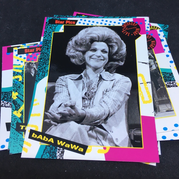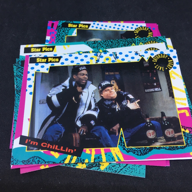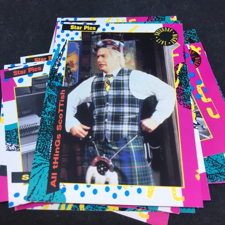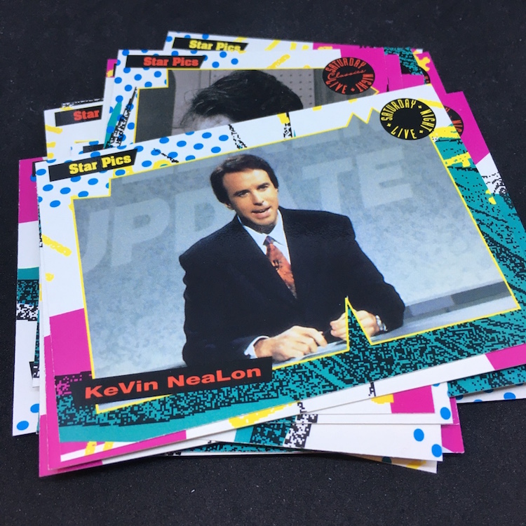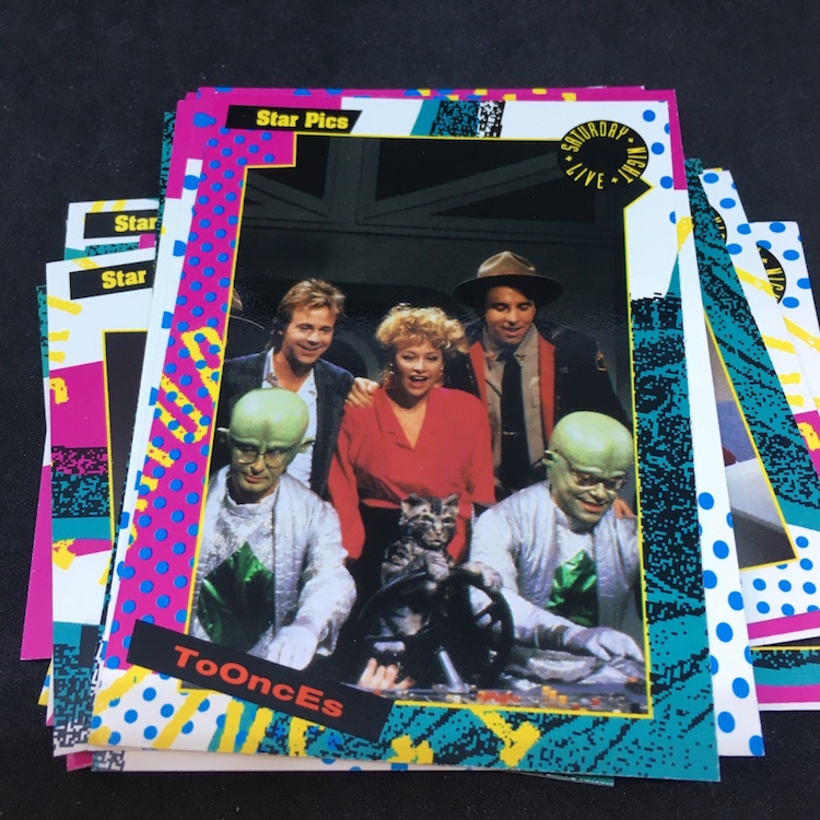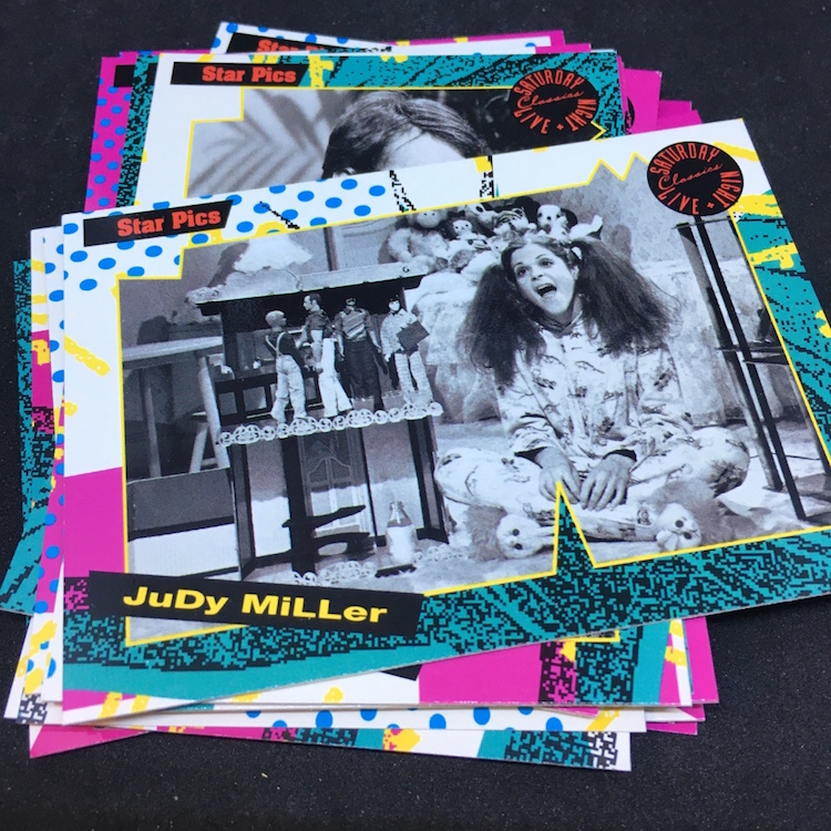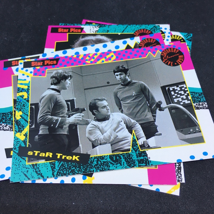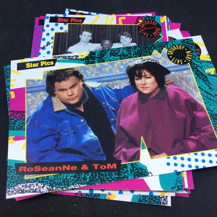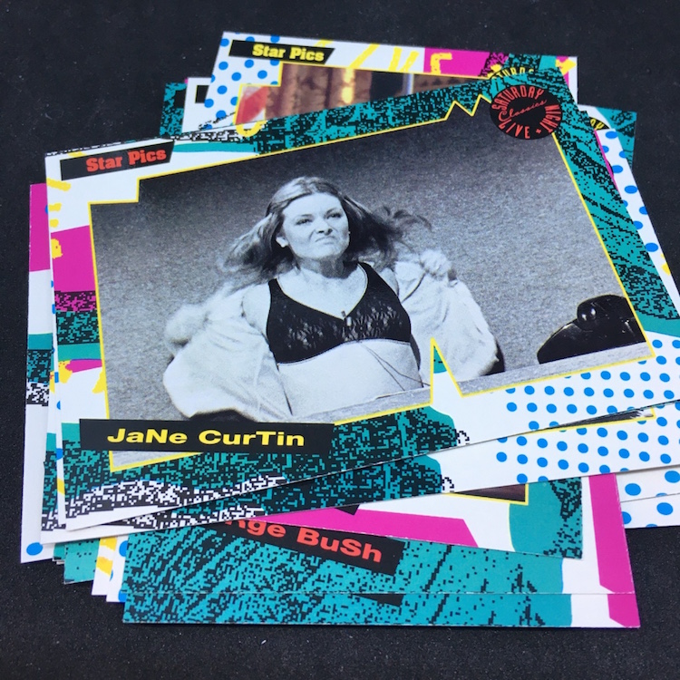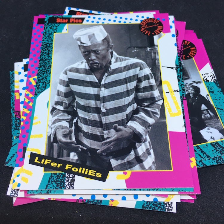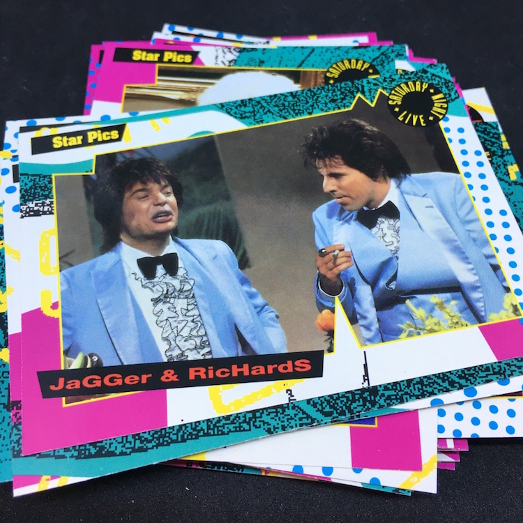 Base cards – See gallery ... among the notable cast members, skits or those parodied here? Adam Sandler, Al Franken, Arsenio Hall, Axl Rose, Bill Murray, Bob Dylan, Chevy Chase, Chris Farley, Chris Rock, The Church Lady, Colon Blow, The Coneheads, Dan Aykroyd, Dana Carvey, Dennis Miller, Gilda Radner, Hans & Franz, Jane Curtin, John Belushi, Julia Sweeney, Keith Richards, Kevin Nealon, Mick Jagger, Mike Myers, Nat X, Pat, Phil Hartman, The Richmeister, Rob Schneider, The Samurai, Sprockets, Star Trek, Steve Martin, Stuart Smalley, The Super Fans, The Blues Brothers, The Not Ready For Prime Time Players, Tim Meadows, Tina Turner, Tom Petty, Toonces The Cat, Victoria Jackson, Wayne's World and Weekend Update among others.