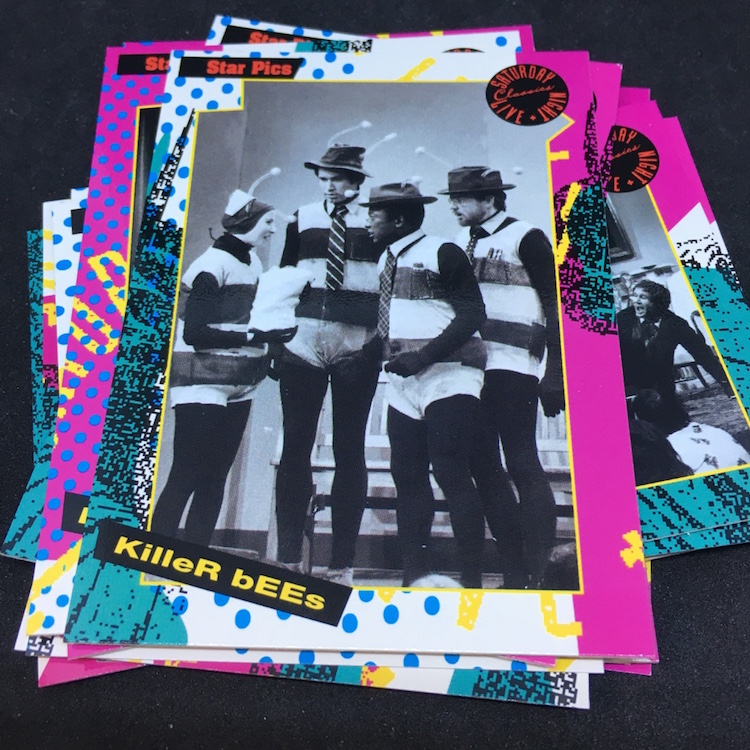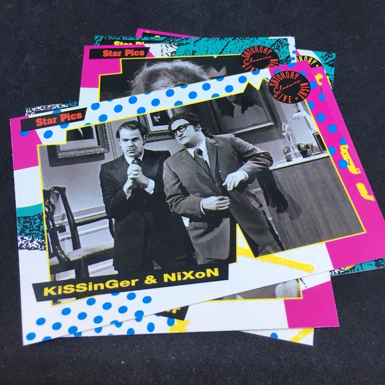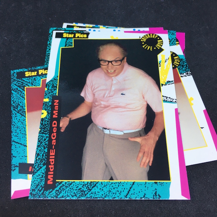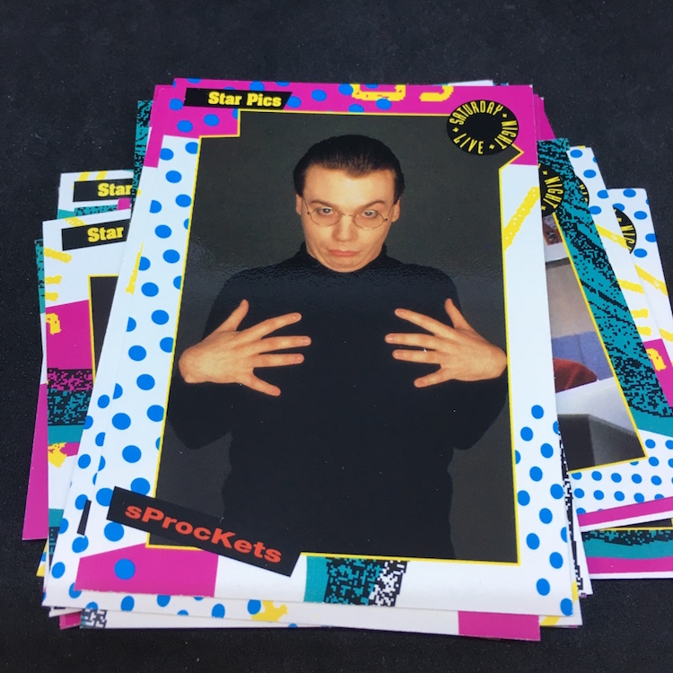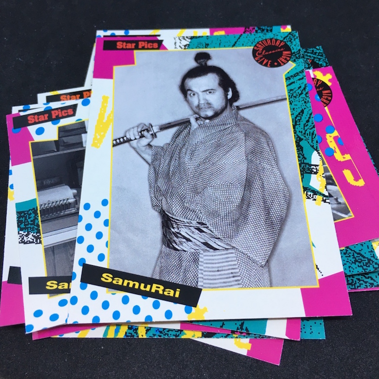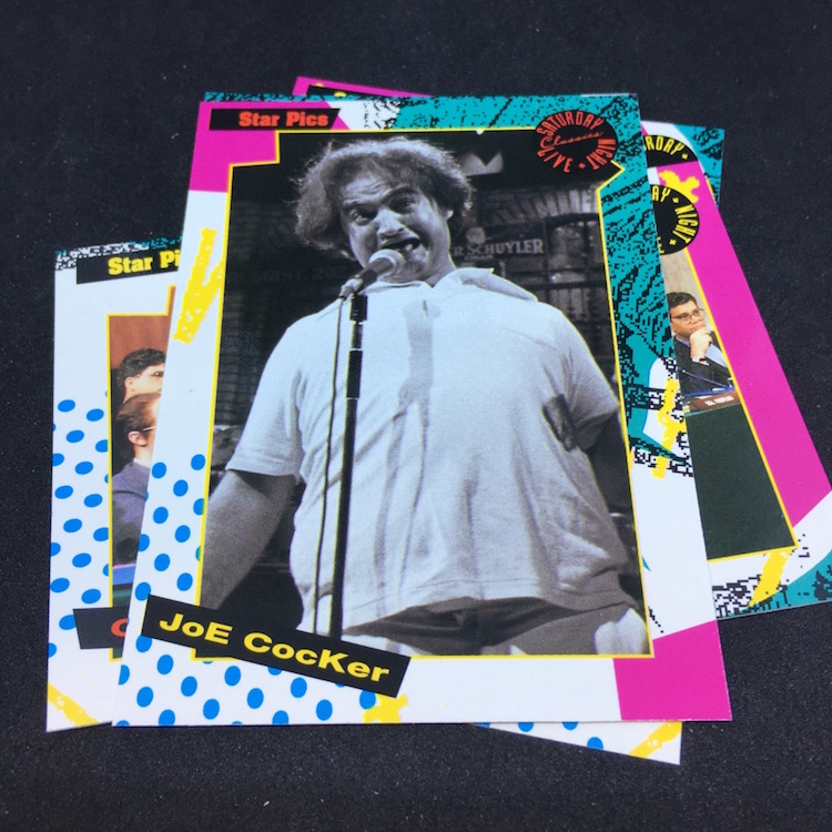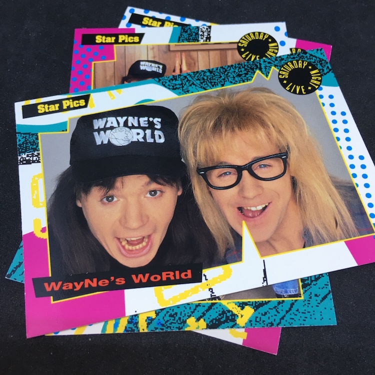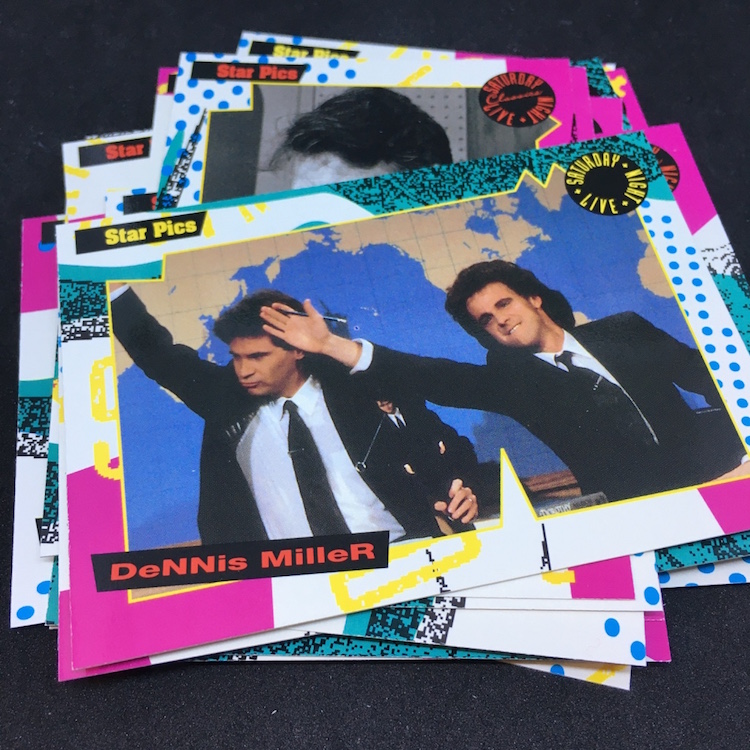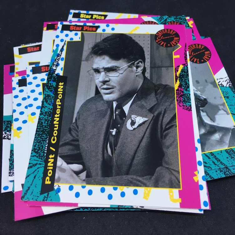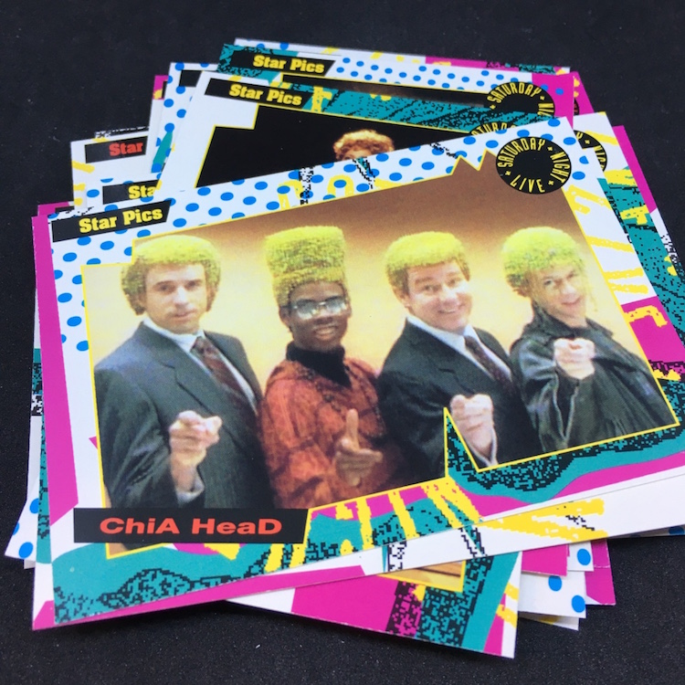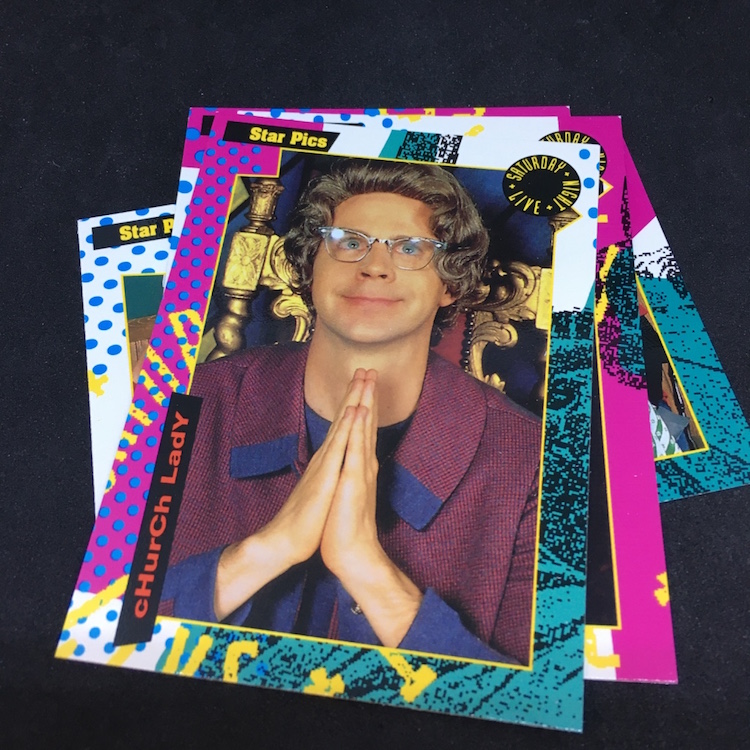 Base cards – See gallery ... among the notable cast members, skits or those parodied here? Adam Sandler, Al Franken, Arsenio Hall, Axl Rose, Bill Murray, Bob Dylan, Chevy Chase, Chris Farley, Chris Rock, The Church Lady, Colon Blow, The Coneheads, Dan Aykroyd, Dana Carvey, Dennis Miller, Gilda Radner, Hans & Franz, Jane Curtin, John Belushi, Julia Sweeney, Keith Richards, Kevin Nealon, Mick Jagger, Mike Myers, Nat X, Pat, Phil Hartman, The Richmeister, Rob Schneider, The Samurai, Sprockets, Star Trek, Steve Martin, Stuart Smalley, The Super Fans, The Blues Brothers, The Not Ready For Prime Time Players, Tim Meadows, Tina Turner, Tom Petty, Toonces The Cat, Victoria Jackson, Wayne's World and Weekend Update among others.