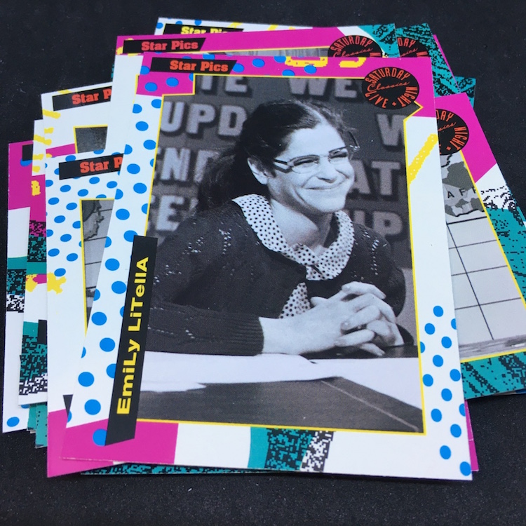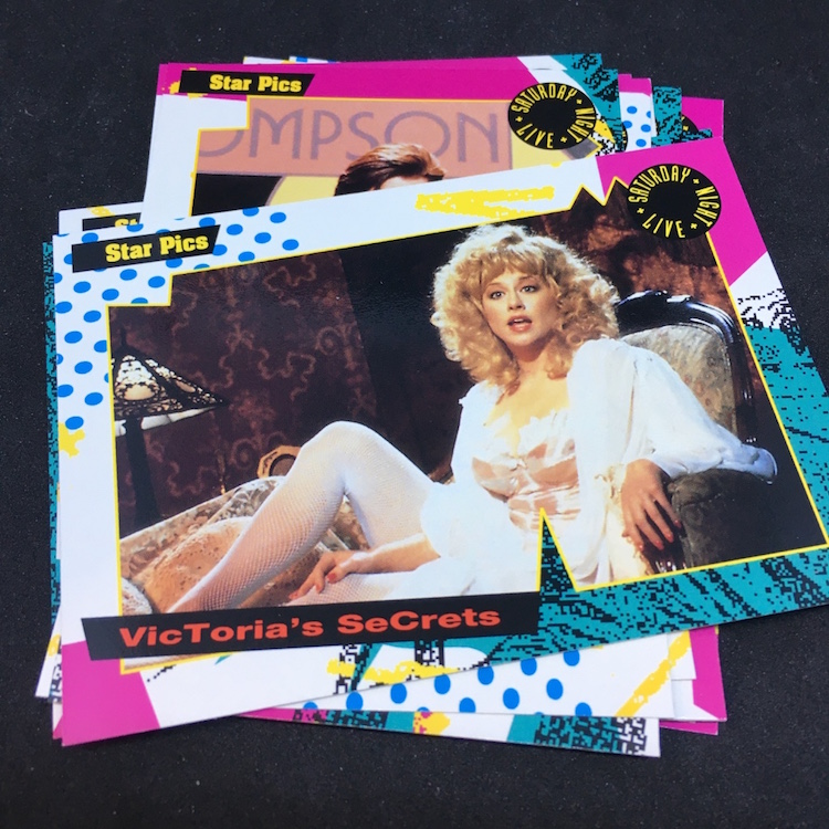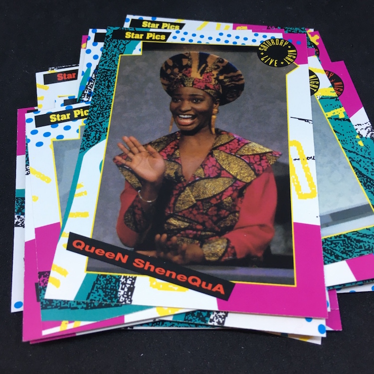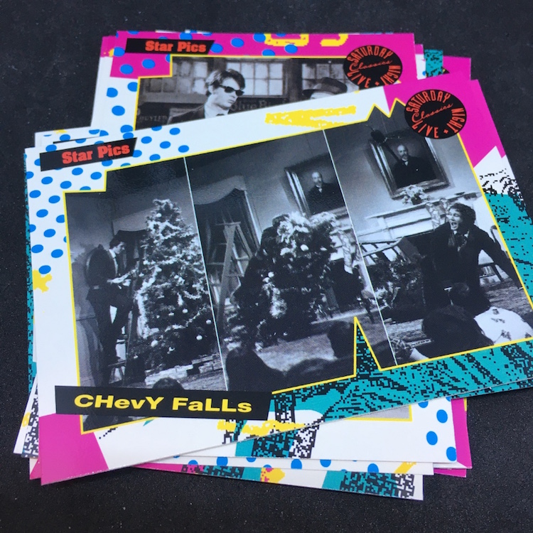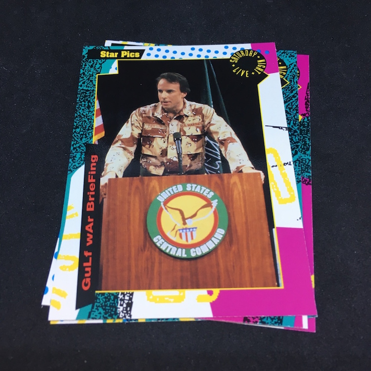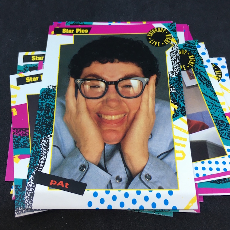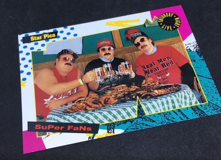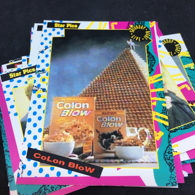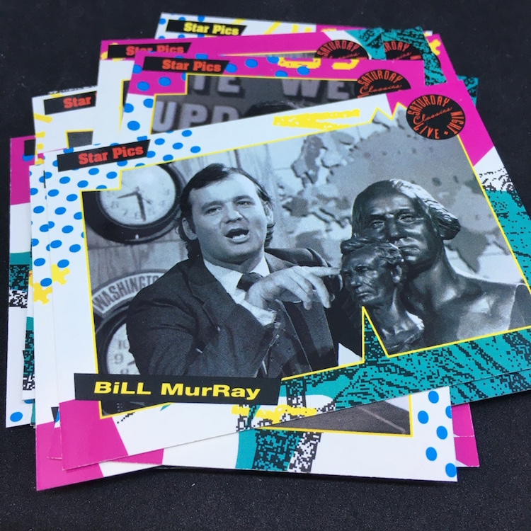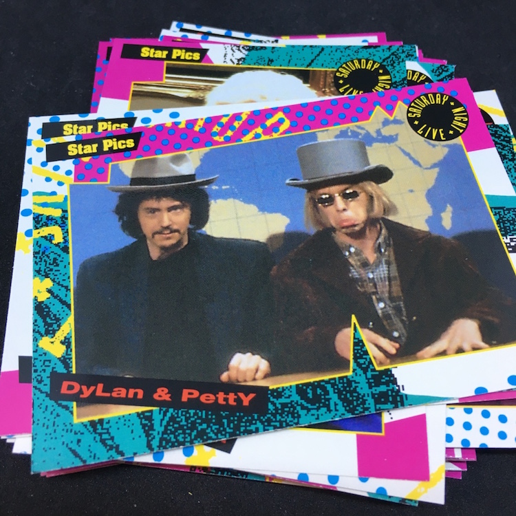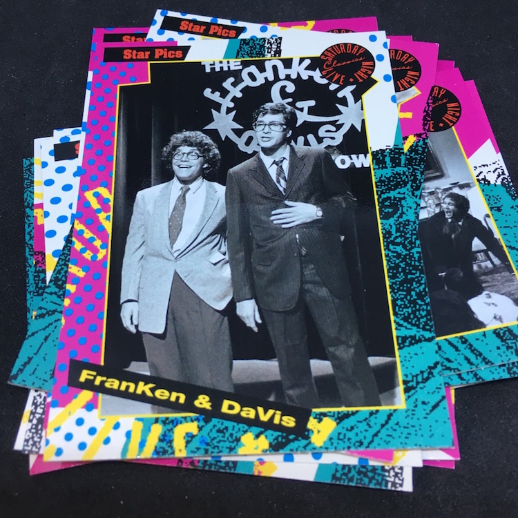 Base cards – See gallery ... among the notable cast members, skits or those parodied here? Adam Sandler, Al Franken, Arsenio Hall, Axl Rose, Bill Murray, Bob Dylan, Chevy Chase, Chris Farley, Chris Rock, The Church Lady, Colon Blow, The Coneheads, Dan Aykroyd, Dana Carvey, Dennis Miller, Gilda Radner, Hans & Franz, Jane Curtin, John Belushi, Julia Sweeney, Keith Richards, Kevin Nealon, Mick Jagger, Mike Myers, Nat X, Pat, Phil Hartman, The Richmeister, Rob Schneider, The Samurai, Sprockets, Star Trek, Steve Martin, Stuart Smalley, The Super Fans, The Blues Brothers, The Not Ready For Prime Time Players, Tim Meadows, Tina Turner, Tom Petty, Toonces The Cat, Victoria Jackson, Wayne's World and Weekend Update among others.