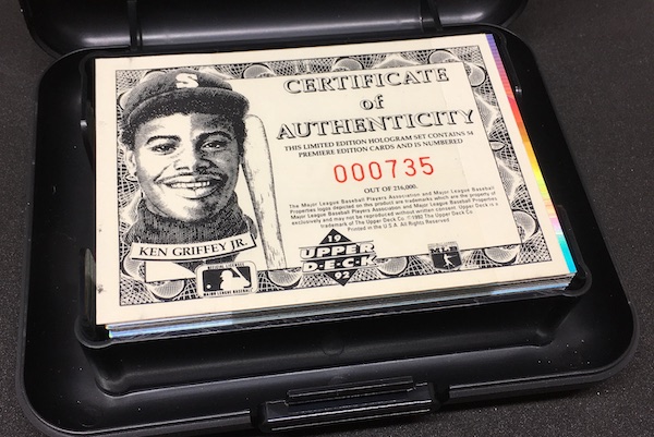 What's Buzz-worthy: For #TBT this week, I'll go with a throwback that feels modern yet is more than 30 years old (!) and loaded with Hall of Famers and past stars. I found this for $9.99 sealed and bit with an idea of perhaps grading -- and might do a couple, though the stock here is a little sticky ... but not to the point of bricking or damage. (Some holograms also have issues often ... so may not be all that grading friendly.) A total of 216,000 sets were made and a numbered certificate is inside every set here -- this one had a pretty low number -- and the look of that cert might make for a fun gimmick slab if yours is cleaner than mine or has a meaningful plateau or Griffey number. I picked off my player here back when these arrived -- it's a set with each team's top pitcher and its top hitter based on their picks at the time while the two checklists that start things off below are the reigning league MVPs. All in all, there's a lot to like here, though this one is simple with no chases ... I like it but I wouldn't over-pay for it.