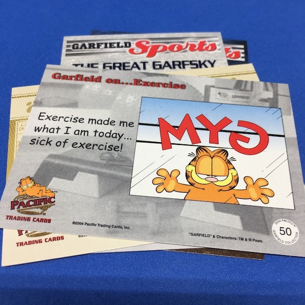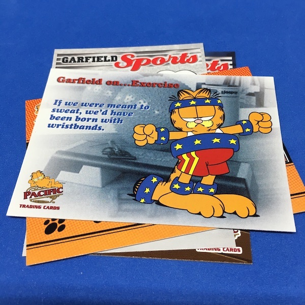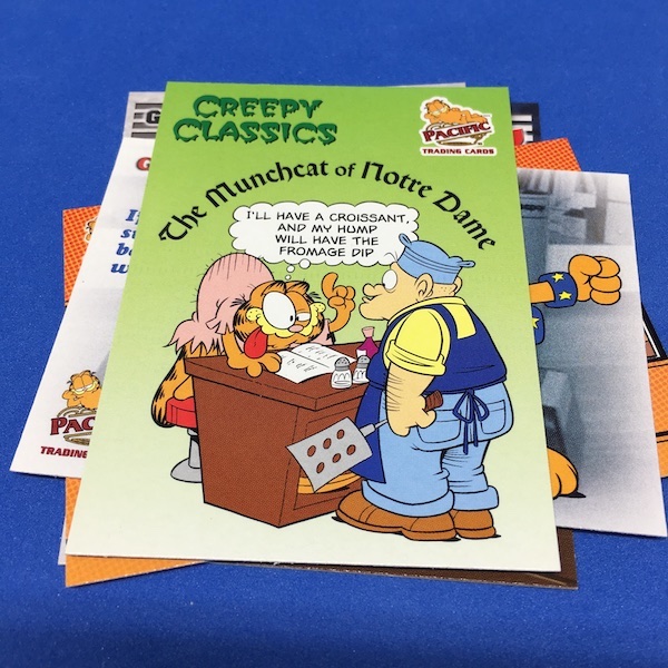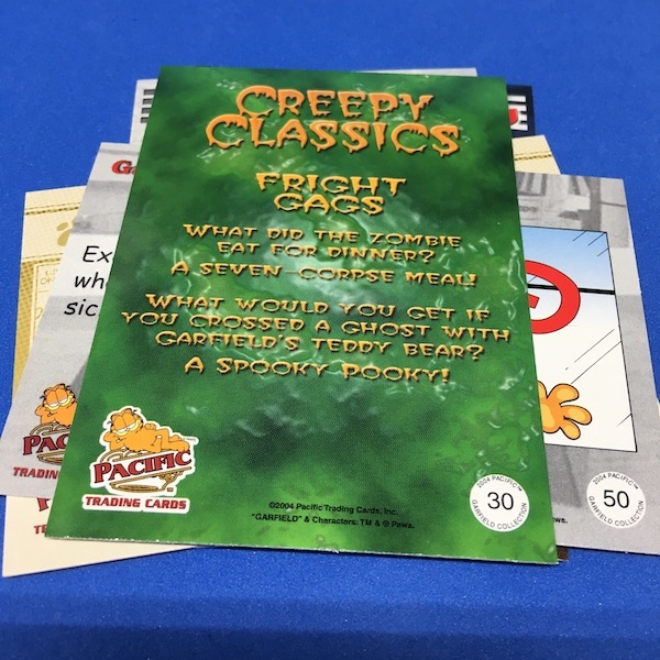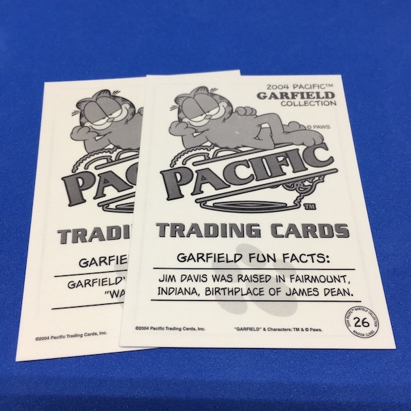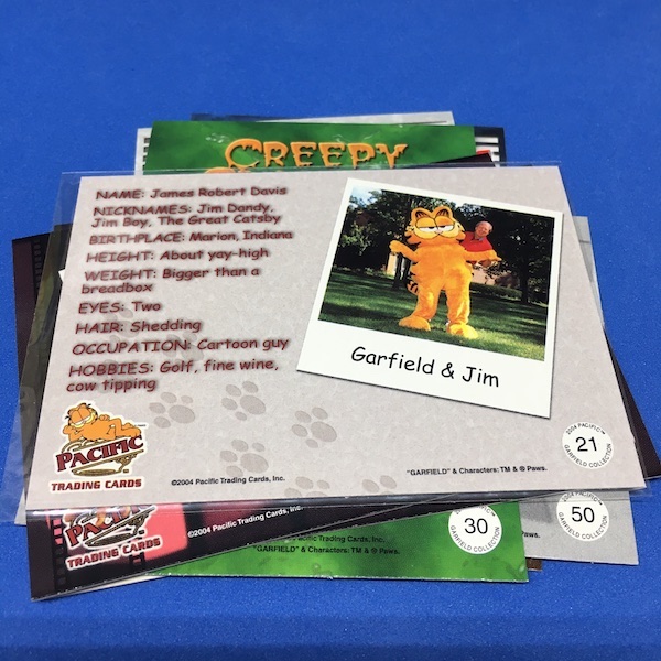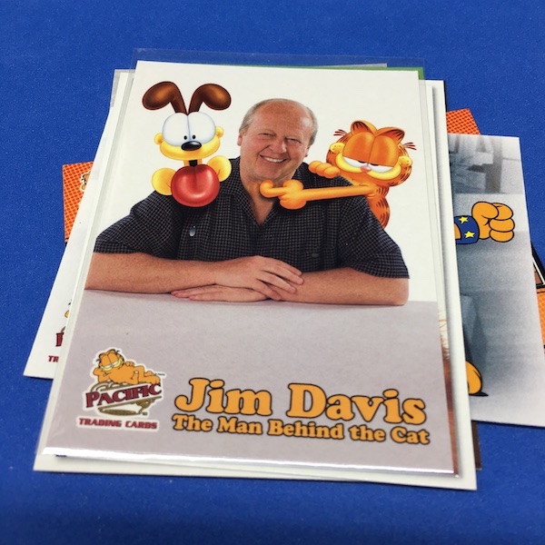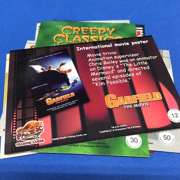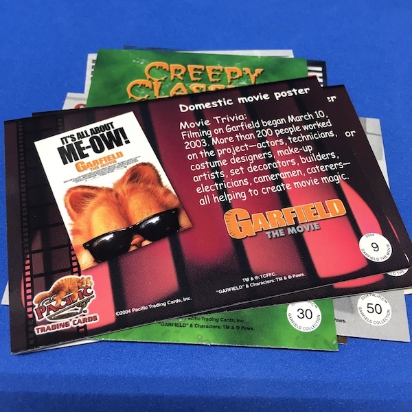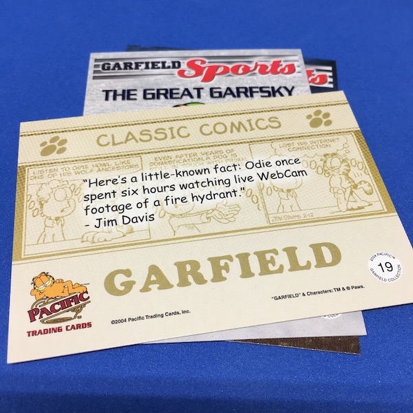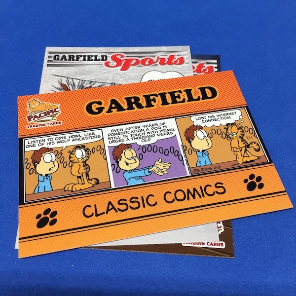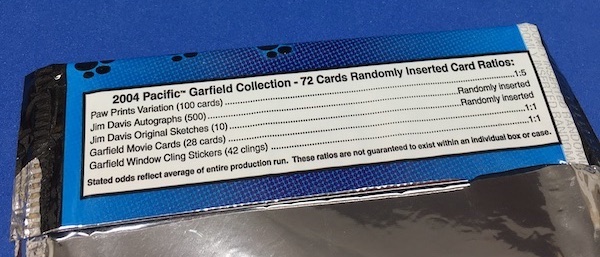 What's Buzz-worthy: For #TBT this time, I went with a super-quick pair of packs from a junk repack lot I picked up long ago. It was so rough that only a couple brands from this one would even be worthy here -- and this one might be a stretch but at least it's newer with some good potential. This one isn't some landmark set but it does have some good chases from late in the life of Pacific Trading Cards, a former major company (trademarks now owned by Panini) that once held MLB and NFL card licenses among other things. This one has a 72-card base set, a movie set (the film had Jennifer Love Hewitt in the cast and she has cards here), the stickers and then parallels where a paw print stamp is added. The big chase? Garfield creator Jim Davis signed 500 cards that were randomly placed into packs and also did a limited number of sketch cards, too. When Pacific went away I remembered finding full boxes of this one at Walmarts for $10 or less and opened a few with hopes for the ink but never landed one ... they aren't that easy but they could still be in there. Sealed boxes here are pretty strong in terms of asking prices and sales prices (though not as high) these days, likely because they got ripped for the most part and the overall production here was likely not that massive.