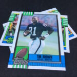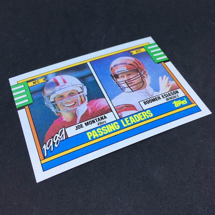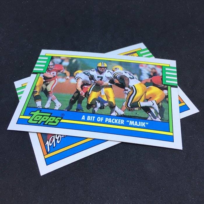 "Vintage" cards (6) – All 1990 Topps -- Joe Montana & Boomer Esiason, Don Majkowski (Packers team card), Tim Brown, Steve McMichael, Eric Ball, Simon Fletcher
