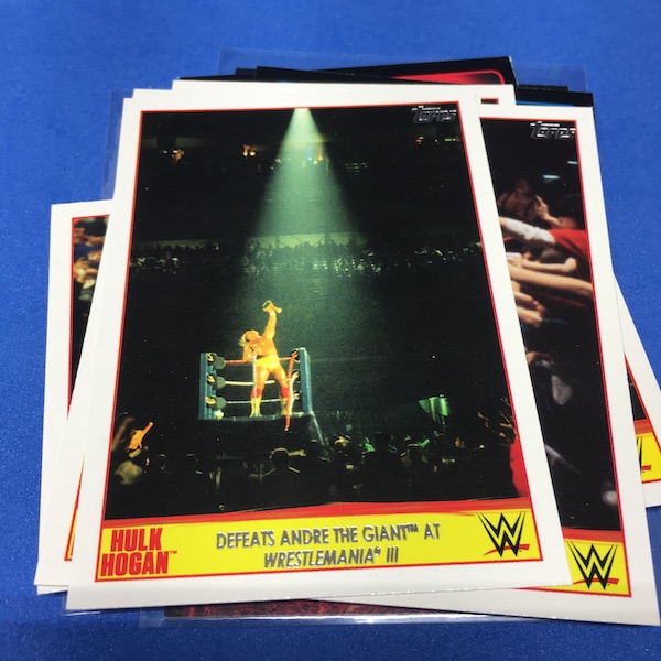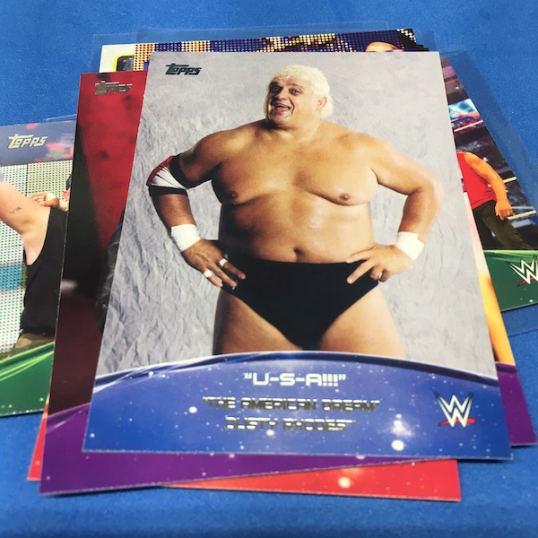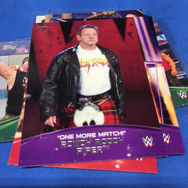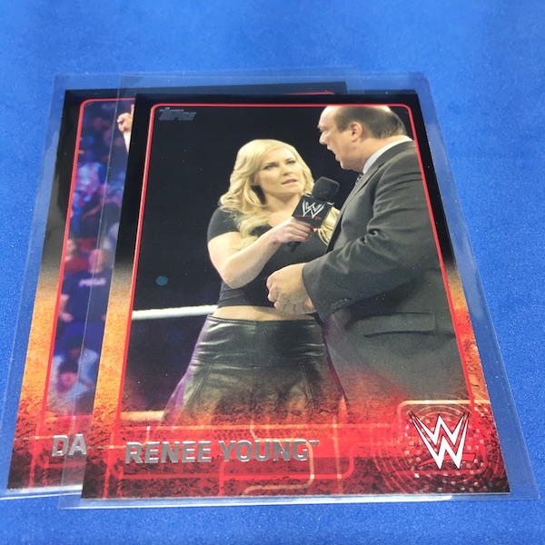 Notables on base cards: The Rock, Ric Flair, Roddy Piper, Roman Reigns, Jerry Lawler, Brock Lesnar, Daniel Bryan, Triple H, A.J. Lee, Daniel Bryan, Eden, Jey Uso, Layla, Natalya, Paul Heyman, Renee Young, Stardust, Goldust, Bret Hart, Hulk Hogan, Ultimate Warrior and others.