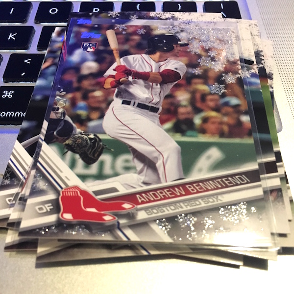 What's Buzz-worthy: It might be about time for a new edition of this one to be announced, so I figured this was worth a look after finding it in a bargain bin. I didn't do this one much at all last year after ripping into them heavily two years ago, but this particular box delivered very well with a few key Rookie Cards and two top rookies among the parallels. Pulling any particular parallel isn't easy -- one in 40 boxes -- so that makes this box's combo of Bregman and Benintendi pretty solid. These are simple cards -- snowflakes applied to the basic Topps flagship design -- and this set includes notables from all three Topps flagship releases (Series 1, Series 2 and Topps Update) to help amp up the checklist There's some decent ink possible, too. Click here to view the final checklist for the release. There is a hit in every box, though this one wasn't that flashy. You can still track one of these down at the link above if you don't find it hunting in the wild.