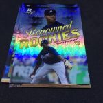 What's Buzz-worthy: This is a brand perhaps best tried in this format, which guarantees two autographs for a starting price of $80. The blaster boxes are very lean this year and the combination of the two makes me wonder whether the sweet spot is somewhere in the middle in both volume of packs, hits and price. I only say that because this one felt like it was closer to an average box in terms of its highlight cards. The Gold parallel in this box is one in 396 packs, while the Blue is one in 132 but either seems to be a headline-grabbing card. The SP rookies are good finds here that help the box, too, but ultimately it didn't feel all that flashy on the whole -- though there are plenty of prospects in this one to help out over the long haul. Another reason this format is better is you get five cards per pack instead of four in blasters, which means more prospects. ... As said before, the stock here is skinny but the cards seemed clean and free of issues you might see for foilboard. There are other potential finds here like photo variations and ink but they were not here this time. One thing that did jump out at me? How oddly color-free most of the card backs are here -- it's pretty striking to be be only in black and white for all but two cards in this box. Not a big deal, but it seemed odd for a brand that should have a good demand as a Walmart-only release loaded with prospects and rookies that can truly deliver big.