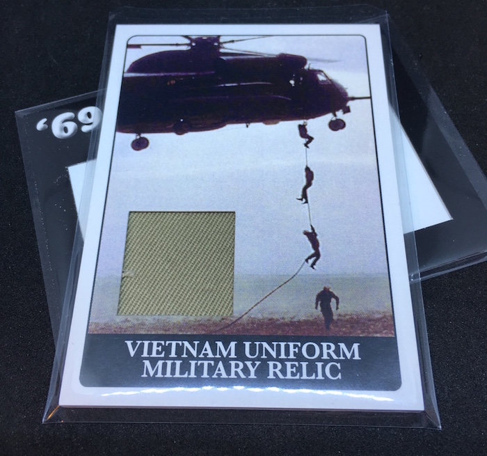 What's Buzz-worthy: I've had my eye on trying this oddity for a while now and finally bit on a box this weekend. Why? I watched a case break of this one that coughed up a Reggie Jackson Rookie Card and a number of decent autographs including Jackson, William Shatner, Red Grange and O.J. Simpson atop other autos as well as some of the weirder cards I've ever seen such as automotive keys embedded into cards. I didn't land one of those (they're in roughly every third box) but I did land an autograph for a Pro Football Hall of Famer and member of the 1972 Miami Dolphins. This set revolves around everything happening in 1969 with countless nods to that year in varying ways. Cut autos are one in three boxes and also in the mix are coin cards, Shatner Relics (and relic autos), stamp cards and Vietnam War uniform relics that you see here. Each box has a pair of original 1969 baseball cards (both of mine being high-number cards and in decent shape other than centering) and stars are possible as the company bought a few complete sets for the release. Just 250 cases of this one were made so the base cards and parallels are on the rarer side -- but I'd rather have a little more volume there just to expand upon the concept a little more. The company also has a pair of bounties for those who take on the challenge of trying to build two of the parallel sets. I may try a jumbo box of this one (basically a few more hits) of this one at some point though all I think I really want from one of these is a key card from a certain type of car from back in the day.