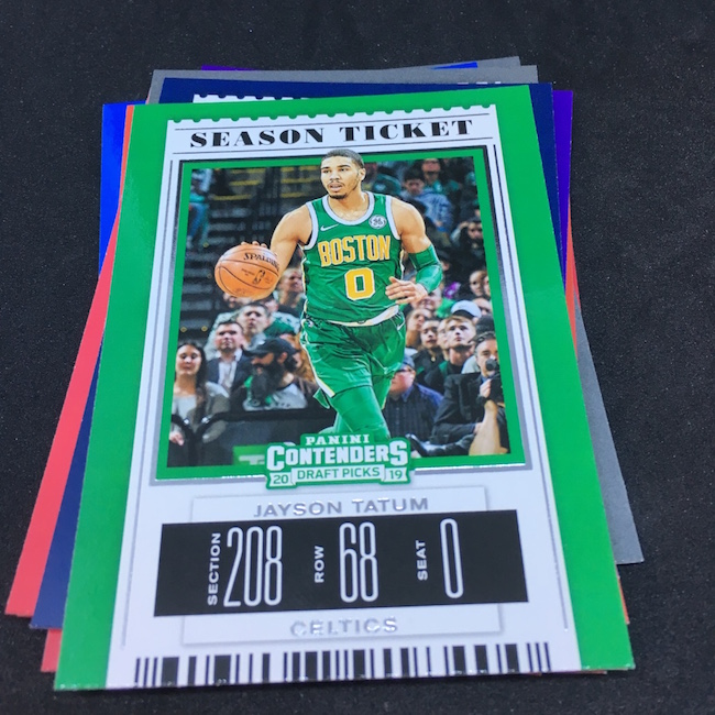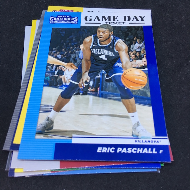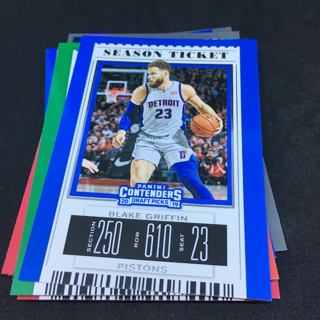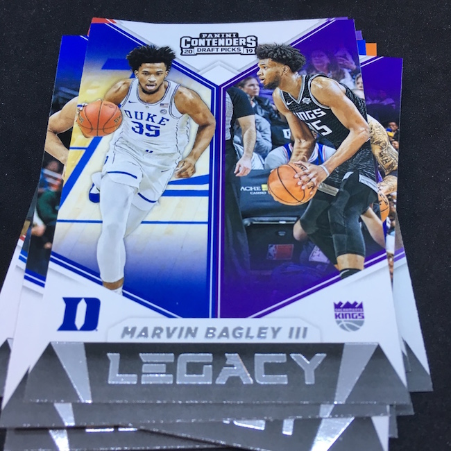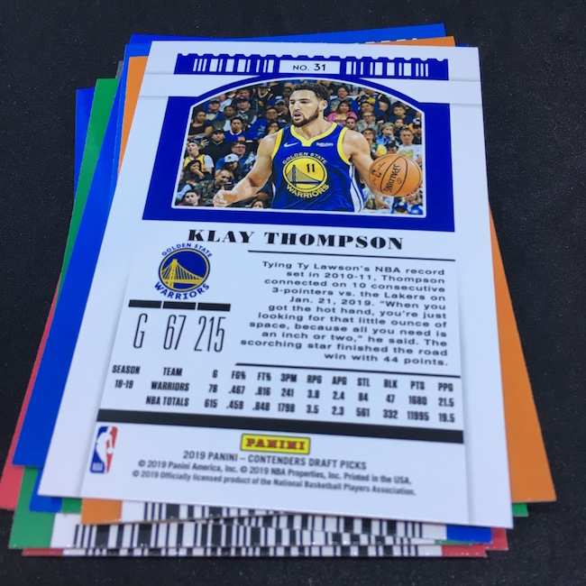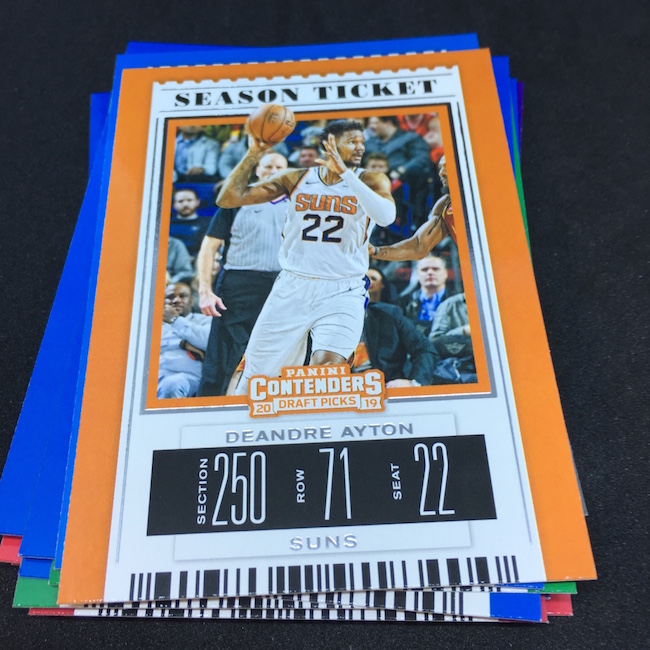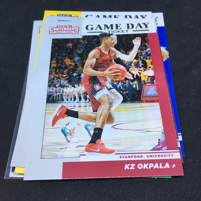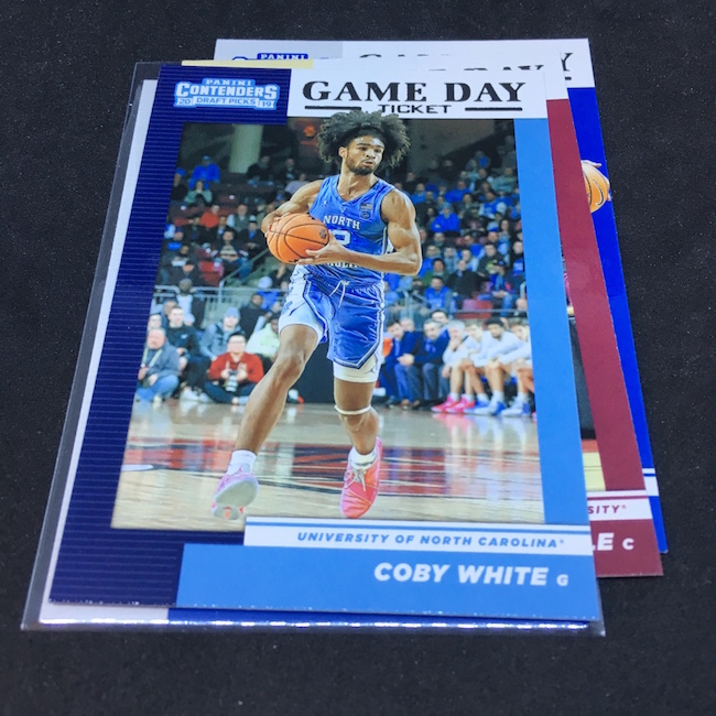What’s Buzz-worthy: The Zion Williamson chase hits retail for the first time with the arrival of these boxes with an autograph in every one and Williamson among them. This is a simple break where I opted to do two and landed Williamson in each of them on different cards and with no duplicates in either box. The base set is comprised of 50 cards with two versions per player and I only landed one duplicate name there, Kawhi Leonard, and both sets delivered in equal numbers. How can you tell them apart? Check the black bars below the team logo on the card backs -- there will either be one bar or three (see at right). The same type of approach is used on the ink as there are plenty of variations in this one and with parallels on top of that. ... You get NBA players in their NBA unis in the base set here and the school colors are found in the inserts and ink and many types are listed on the breakdown on the side of the box. The release follows the formula of Contenders and the hobby boxes deliver an auto in every pack and six per box -- and probably easier odds at the big guy. There are a lot of possibilities in this one for ink no matter the format you try but these retail boxes will vanish fast given all of the new-collector interest in the No. 1 pick.