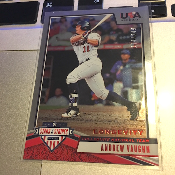 What's Buzz-worthy: The yearly Stars & Stripes set hits retail once again with a Longevity version of the base set found in hobby boxes and two hits guaranteed per box. This box seems like it delivered pretty well with two autos and the only insert being of the 2018 Golden Spikes Award winner as the top player in college baseball and a likely first-round pick. The set includes cards for three squads -- the Collegiate National Team, 18U National Team and the 15U National Team. Both hits here were long-term ink -- members of the 16U National Team who won't even be draft eligible until they're done with high school, meanwhile the base cards are loaded with potential draft picks this year and in the future. The Longevity finish does mean foilboard -- you'll probably see fingerprints in the gallery as I sorted these to see if any dupes -- but they're crisply printed on a simple design that showcases photos well. About the only drawback is the names in foil -- a move that makes them a little tougher to read for us old guys not on the 16U team. While I'm sure most of the big stuff is in the hobby boxes of this one (hit that link above) it seems stuff could be in play here in a pretty affordable blaster-priced package. If your retail aisle is running lean, these are a no-brainer with two hits every time.