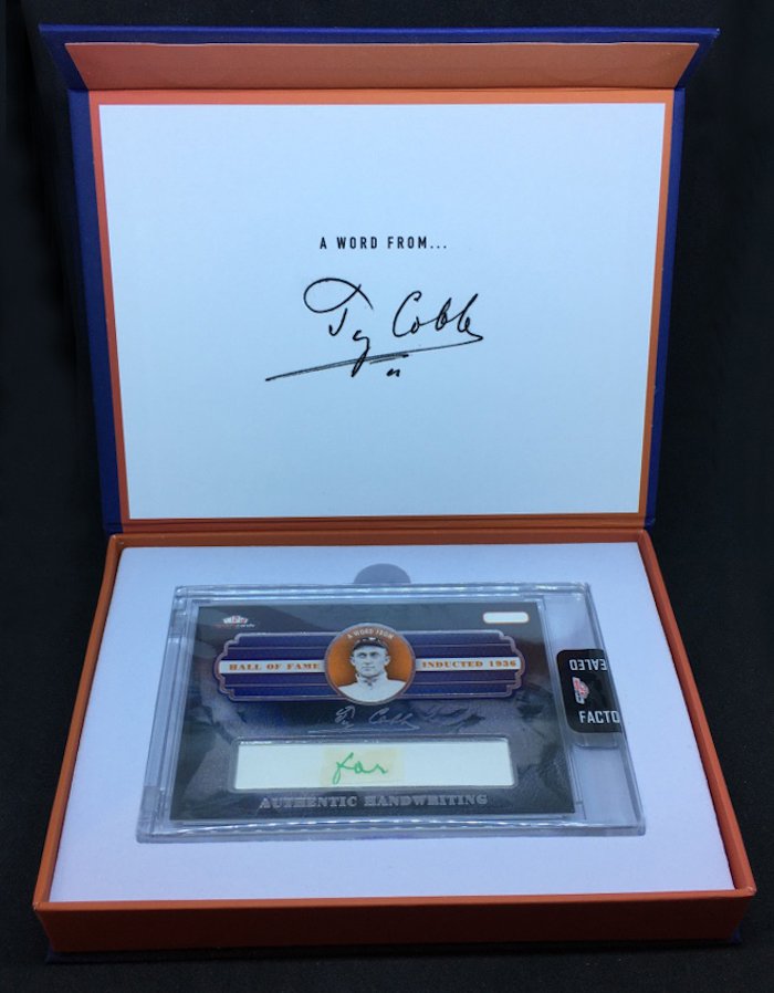 What's Buzz-worthy: If you're a regular reader, you may have seen my previous break of one of these boxes ... but, if not, here's one more. It's a little more brief this time on the card itself but below are some thoughts and facts on this one -- reasons you might consider opening one of these boxes for the Hall of Famer. ... This is exactly what it says it is -- a word from Ty Cobb -- as in a word from a lengthy hand-written letter from the tip of one of his famed green-ink pens presented as a cut autograph would be ... but without the steep price for his six-letter sig. The cuts come from letters authenticated by JSA and this release is one that was fully authorized by Cobb's estate via CMG Worldwide. As part of the release you can actually see the lengthy letter from 1955 that apparently made up this one -- 24 pages -- and the company released scans of the letter so collectors can find their word (I'm still not crazy enough to try to find my two). I grabbed one of these in the big sale, which was a lot lower than its suggested retail price of $79.99. As you can see with this card, it is a little risky as small-letter words (there are "a," "the" and other smalls here) are in here -- they don't sell for much -- but there are chase elements. Every 10-box case will include a something from a lineup that includes potential silver-, gold- and platinum-enhanced cards (165 between all types), as well as 30 printing plates, 15 proof sheet redemptions, 10 cuts where "Ty" is the word -- essentially a half-autograph -- and then some unique 1/1s and a redemption for a signed Hall of Fame card. There's also one case out there where every box includes one of these hit types. Why buy this? Well, I'm not going to be shopping for a Cobb autograph any time soon, so this was an affordable way to get as close as it gets. The presentation is pretty solid with the well-designed and simple box as well as simple cardboard in the design and touches. (It was comfortable enough to give it a try, though I don't think I'd do it at full price.) ... There's a newer and far pricier Babe Ruth release from this company that's a little more advanced than this with words embedded into a slabbed Hall of Fame plaque. The price of a Ty Cobb letter is at least a couple grand and good stuff will cost far more -- as high as $7,000 for cut autos put into packs based on a recent eBay search. I thought this was an interesting way to get something similar since I won't be chasing those types of items for this Hall of Famer.