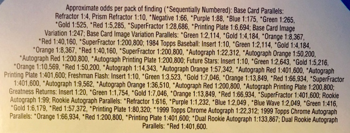What's Buzz-worthy: At first glance this may not look like that good of a box, but Buzz's Walmart excursion paid off with a parallel autograph (one in 416 packs) and a photo variation (one in 247) atop the standard stuff here. Making this decent, too, is the presence of one of the four late-add Rookie Cards (Nos. 201-204) in Eloy Jimenez. FYI: These cards do appear to be shorter in size than others in this release. The design, something I've mentioned previously this year, isn't one of my favorites (mostly because of the flipped name) but there are touches here that seem to be made for Chrome, especially when you land a colored Refractor. My names in the base cards weren't all that flashy and my X-fractors only found in this box could have been better but it delivered very well for the price. I'll admit I don't do a ton of Topps Chrome but this seems like a safe way to chase stuff with autos starting one in 99 packs (one in 10 boxes) if you don't want to do a whole Hobby box. With this year's rookie crop and guaranteed ink over there, though, it is a stronger way to go. These won't always deliver big like this one did but there is better potential here compared to some of the mega boxes released this year.