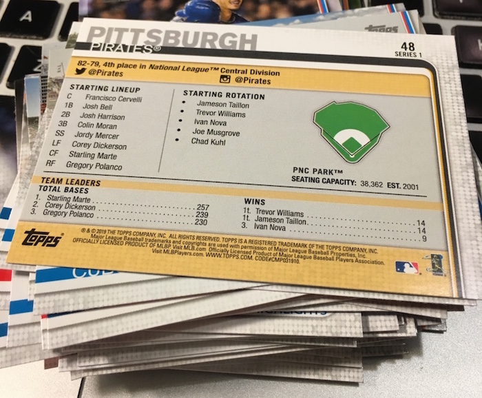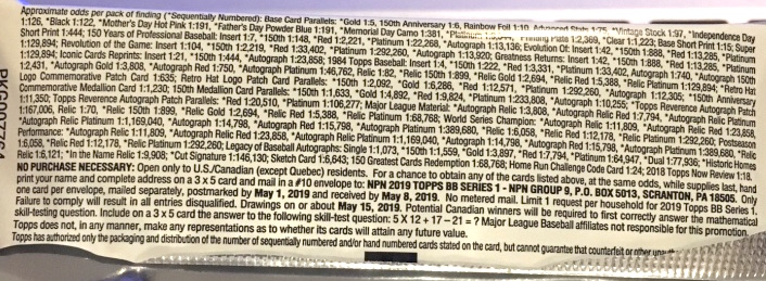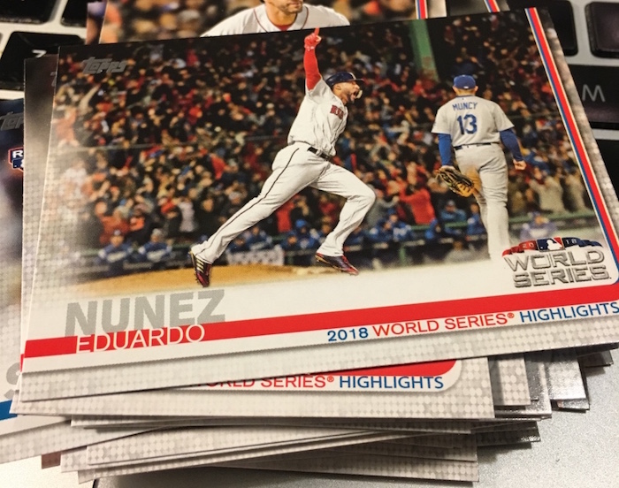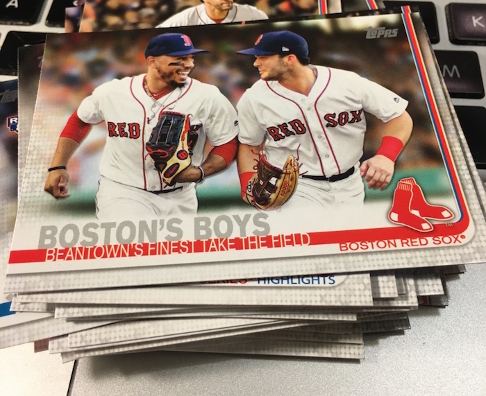 What's Buzz-worthy: A new baseball card season starts right now and, for me, it started with a combination of Niko Goodrum the first card I saw on the back of my first pack and a Nick Markakis on its front. (Does that mean that the Braves win it all this year and it will be a good one? We'll see ... you heard it first here if it happens.) This box delivered pretty well overall but one card alone earns it the A+ -- the Red parallel of a World Series Champion Rick Porcello autograph is a card found one in every 15,798 packs. That's one in 659 boxes (55 cases) if you do the math. These boxes have a little different look this year as they have four more cards per pack but the total drops to just 24 packs instead of 36. It's a move I like, though the insert total was lower than last year. You get a lot more Gold parallels here than last year, which gives you more shots at notable names (I didn't really get any here) and there are a number of parallels and other variations to look for. Photo variations are one in 15 packs, while "advanced stats" cards are one in 75 and you can find others that we're used to such as Black, Vintage and Rainbow stock. All in all, this one felt like a comfortable rip -- perhaps because of fewer packs -- though a few didn't have any inserts and others had a couple. (Check the codes on the backs of base cards to spot your variations as usual. The gallery in the First Buzz preview is still growing on that front.) The 150 Years of Baseball set leads the way here with inserts and parallels -- a good feel for a brand that's known for looking back to the past while also presenting the here and now. We'll get even more of this in Series 2 as well. The non-traditional framing of the fronts gives it a good Stadium Club meets 1982 Topps feel, though I think some of the photos could be stronger with this approach (I expected more cards to have more photos that wowed me). The 1982 feel is reinforced more on the backs. Is the basic design perfect in my mind? No, but all of the overall inclusions give it a feel that is new and flagship all at the same time. I think this design should translate for Chrome, and especially Refractors, very well. I'd still like to see more inserts per pack and box, though this move should help the value of some sets more as they are tougher to build. Basic Topps is a brand that they don't really need to tinker with -- it has the built-in demand no matter what -- but I'm glad to see Topps change and adjust things here and there. Once later series hit this year, hopefully with a strong rookie crop -- perhaps Vladimir Guerrero Jr. in the mix -- we could see some fun stuff that builds upon this one's start.